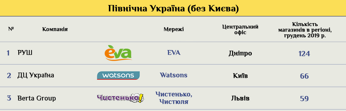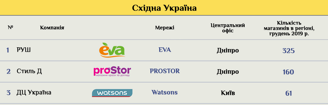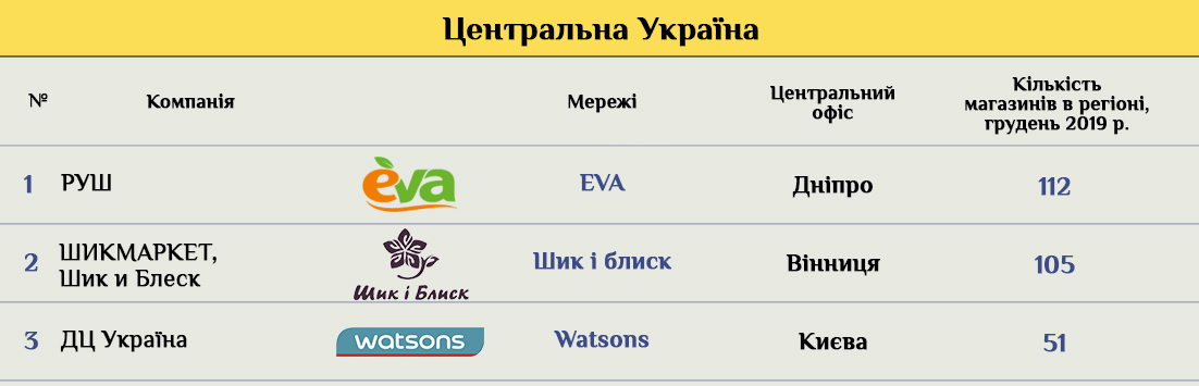 На почесному третьому місці – столична компанія " ДЦ Україна, чия мережа Watsons налічує тут 129 торгових точок. В той же час це регіон, де відкрито найбільше магазинів цієї мережі – приблизно вдвічі більше, ніж в інших частинах країни і майже на 50% більше, ніж у столиці.