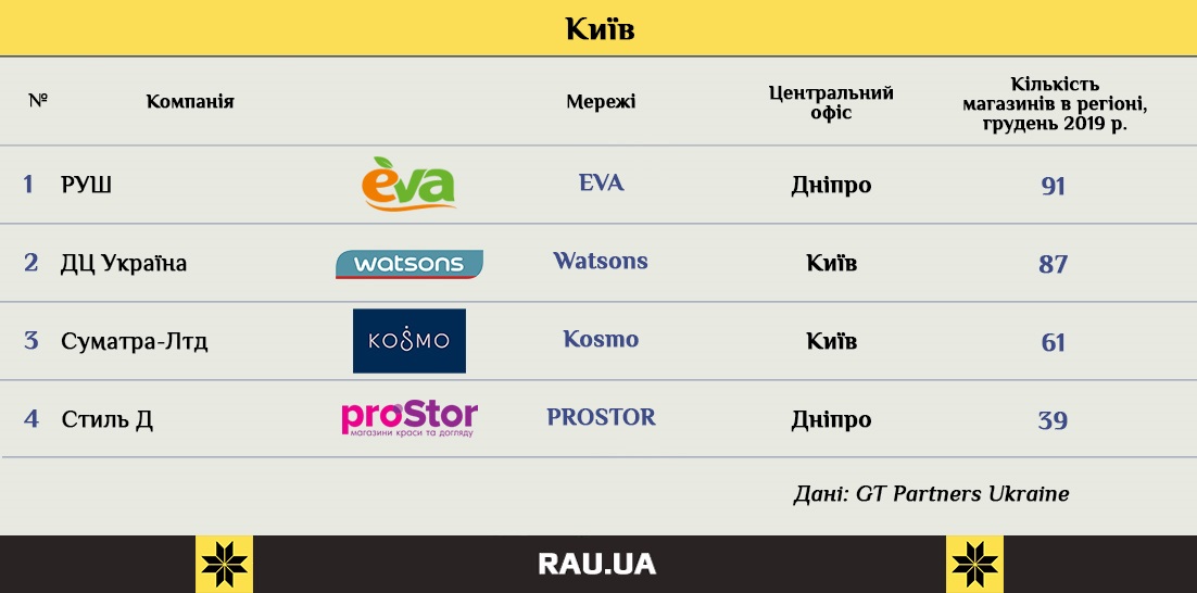 У самому платоспроможному регіоні країни – столиці України – широко представлені чотири великих гравця: EVA, Watsons, Prostor і Kosmo. Так склалося, що київський ринок поділили між собою дві столичні компанії і два рітейлера з Дніпра.