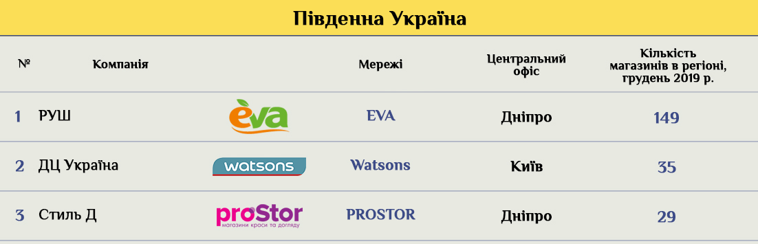 На південному напрямку найбільш помітні три мережі. Конкуренцію київської Watsons та дніпровської EVA становить ще одна компанія з Дніпра – мережа Prostor. Цей гравець розвиває мережу переважно на східному та південному напрямку, а також добре представлений у столиці.