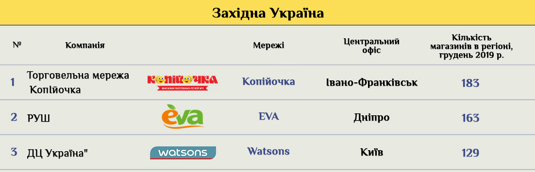 У західному регіоні країни в лідерах серед drogerie-рітейлерів є місцева мережа Копійочка, яка належить однойменної компанії з Івано-Франківська. Це єдиний регіон країни, де в мережі EVA з Дніпра менше магазинів – «всього» 163 проти 183 у Копійочка.