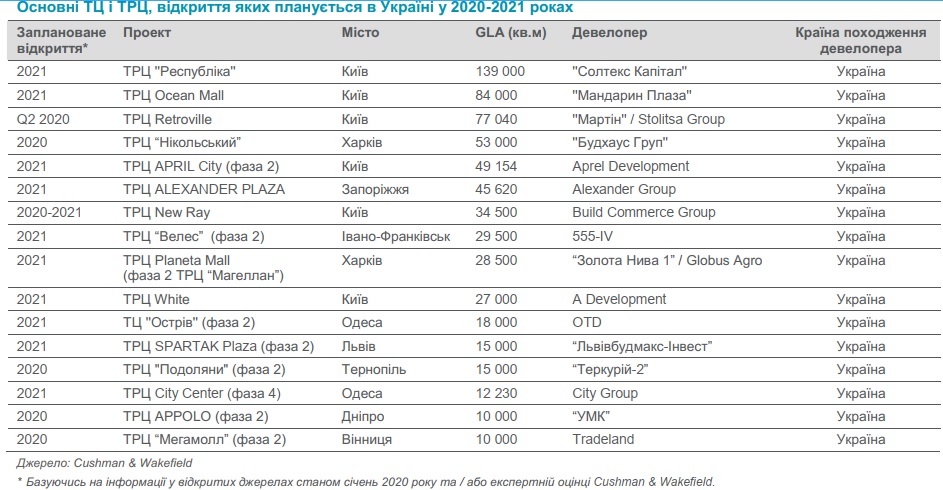 Епідемія коронавіруса і введення карантину також не могли не позначитися на темпах будівництва в країні нових торгових центрів. Незважаючи на це, в Cushman & Wakefield кажуть, що інформації про перенесення термінів введення в експлуатацію нових торгових об'єктів в компанію не надходила. Станом на початок року, до відкриття у нинішньому році було заявлено п'ять торгових об'єктів сумарної орендною площею понад 165 000 кв. м.