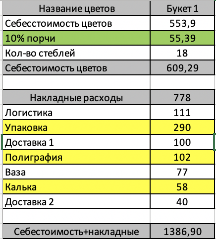 Собівартість — все, що входить у вартість формування одного букета. Також додатково прораховуються накладні витрати, пов'язані з логістикою, податками і т. д.