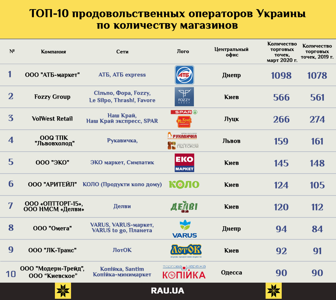 Дослідницька компанія GT Partners Ukraine представила своє чергове дослідження «Топ-160 продуктових операторів України за кількістю магазинів, I квартал 2020-го». Також в звіті експерти проаналізували: хто з рітейлерів і де відкриває нові торгові точки, які формати магазинів найбільш популярні, на що робить ставку той чи інший гравець національного чи регіонального масштабу.