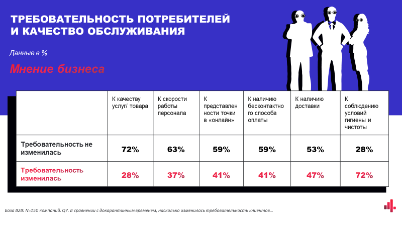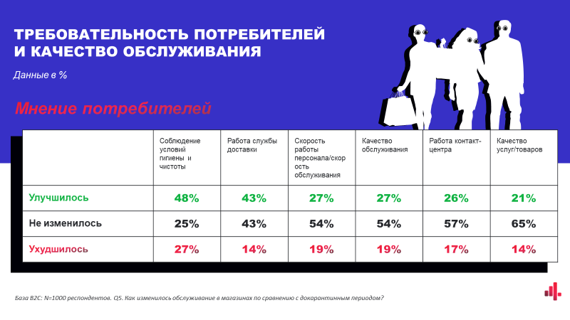 Проте споживачі помітили поліпшення санітарних умов і чистоту торгових залів, а також старання компаній в організації доставки. Компанії теж помітили, що зросла вимогливість гостей до чистоти та виконання санітарних норм.