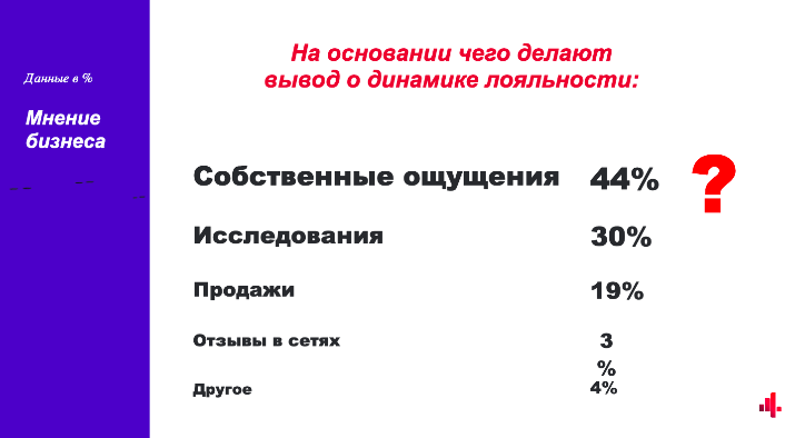 В процесі дослідження стало зрозумілим, що, наприклад, 44% (майже половина!!) бізнесу оцінюють динаміку лояльності згідно з власних відчуттів. І лише 30% компаній реально ЗНАЮТЬ цю динаміку згідно результатів досліджень. Світ змінюється, проте дуже важливо знати та спостерігати ці зміни, аби мати відповідь на важливе питання бізнесу: ЩО РОБИТИ?