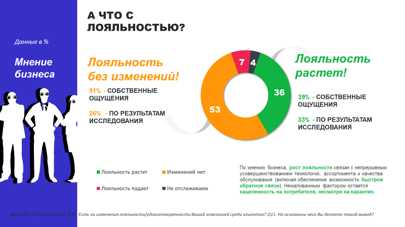 Ще одне підтвердження того, що компанії не приділяють достатньо уваги ситуації: при усвідомленні падіння продажів (65%), 36% опитаних говорять про зростання лояльності, а 53% вважають, що змін немає. При цьому 44% бізнесу оцінюють динаміку лояльності за власними відчуттями.