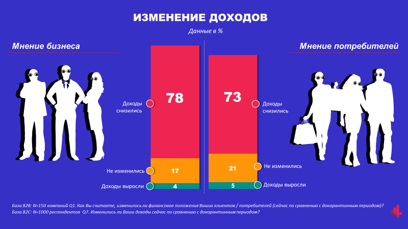 Здавалося б, якщо люди стали менше заробляти, значить прагнути менше витрачати. Виявляється, ні! Лише 43% споживачів стали економити із впровадженням карантину, а 23%, навпаки, стали витрачати більше, ніж до карантину. Бізнес бачить більш песимістичну картину — 65% констатують зниження поточного рівня продажів і всього у 15% — продажі зросли.