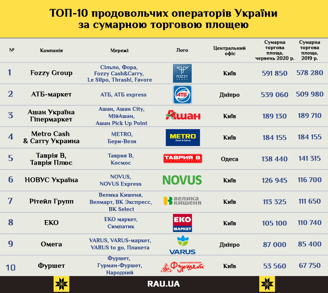 У першій половині 2020 року основні гравці українського продуктового рітейлу зберегли і зміцнили позиції, зайняті два роки тому. Так, наприклад, Ашан, що потіснив Metro Cash & Carry Ukraine з третьої на четверту позицію, так і залишився в трійці лідерів, навіть з урахуванням скорочення сумарної торговельної площі на 580 кв. м.