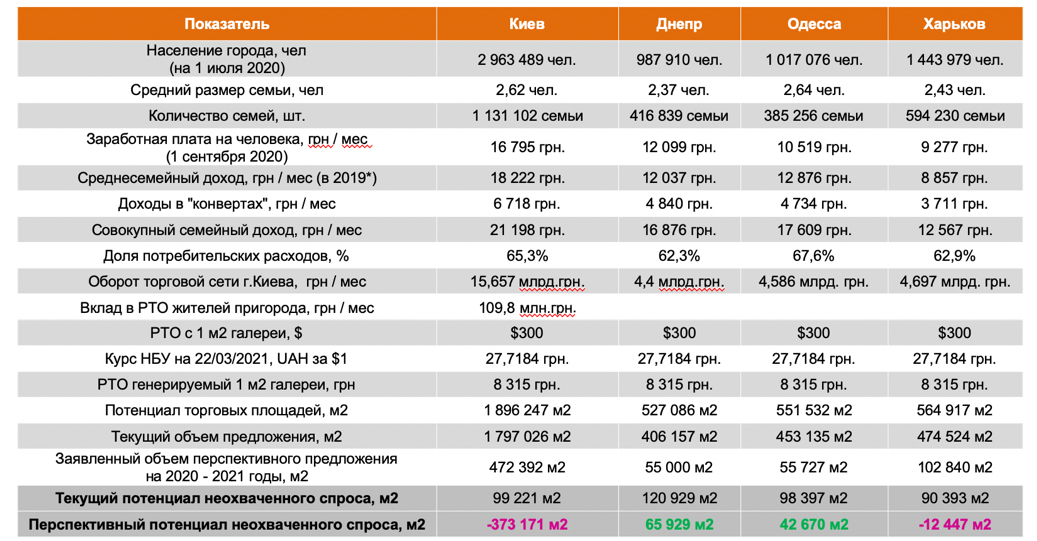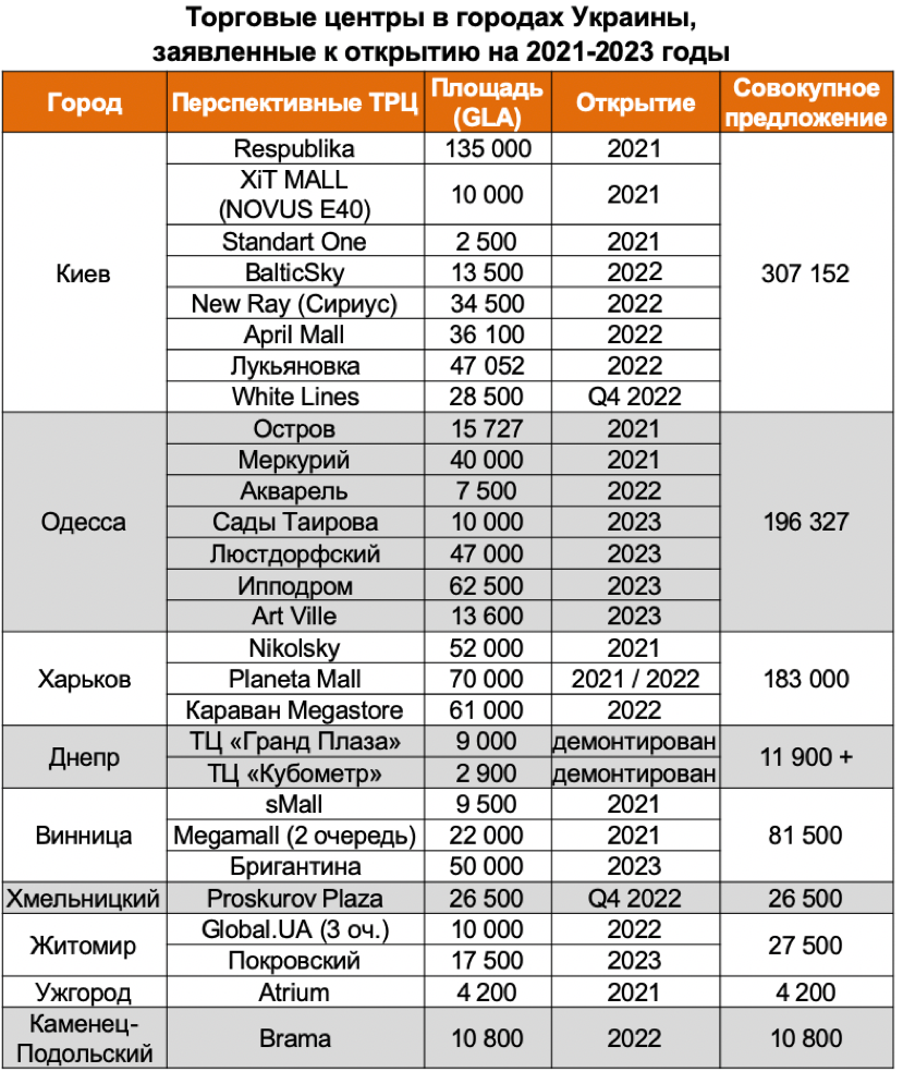 При цьому в цілому ряді міст (в т.ч. в обласних центрах і містах-мільйонниках) зберігається дефіцит торгових приміщень. За даними компанії UTG, поточний потенціал неохопленого попиту в Києві становить 99 221 м2, в Дніпрі - 120 929 м2, Одесі 96 397 м2, Харкові - 90 393 м2. З урахуванням, відкритих у 2021-2023 році об'єктів в Одесі та Дніпрі перспективний попит для розвитку нових ТЦ все ж залишиться.