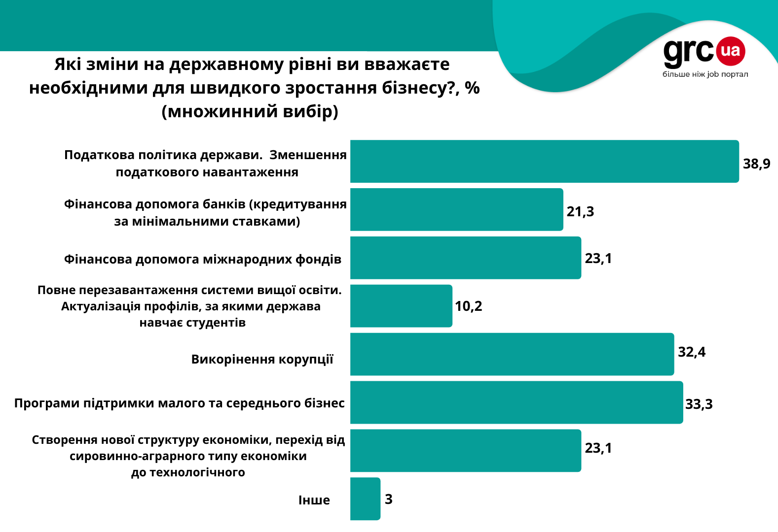 Відчувши серйозні наслідки війни, український бізнес зазначає, що для швидкого зростання бізнесу необхідна підтримка та впровадження змін на державному рівні. Серед бажаних новацій, які допоможуть відновити економіку загалом та діяльність компаній зокрема, підприємці частіше за все озвучують зменшення податкового навантаження, викорінення корупції, впровадження чинних програм підтримки малого та середнього бізнесу.