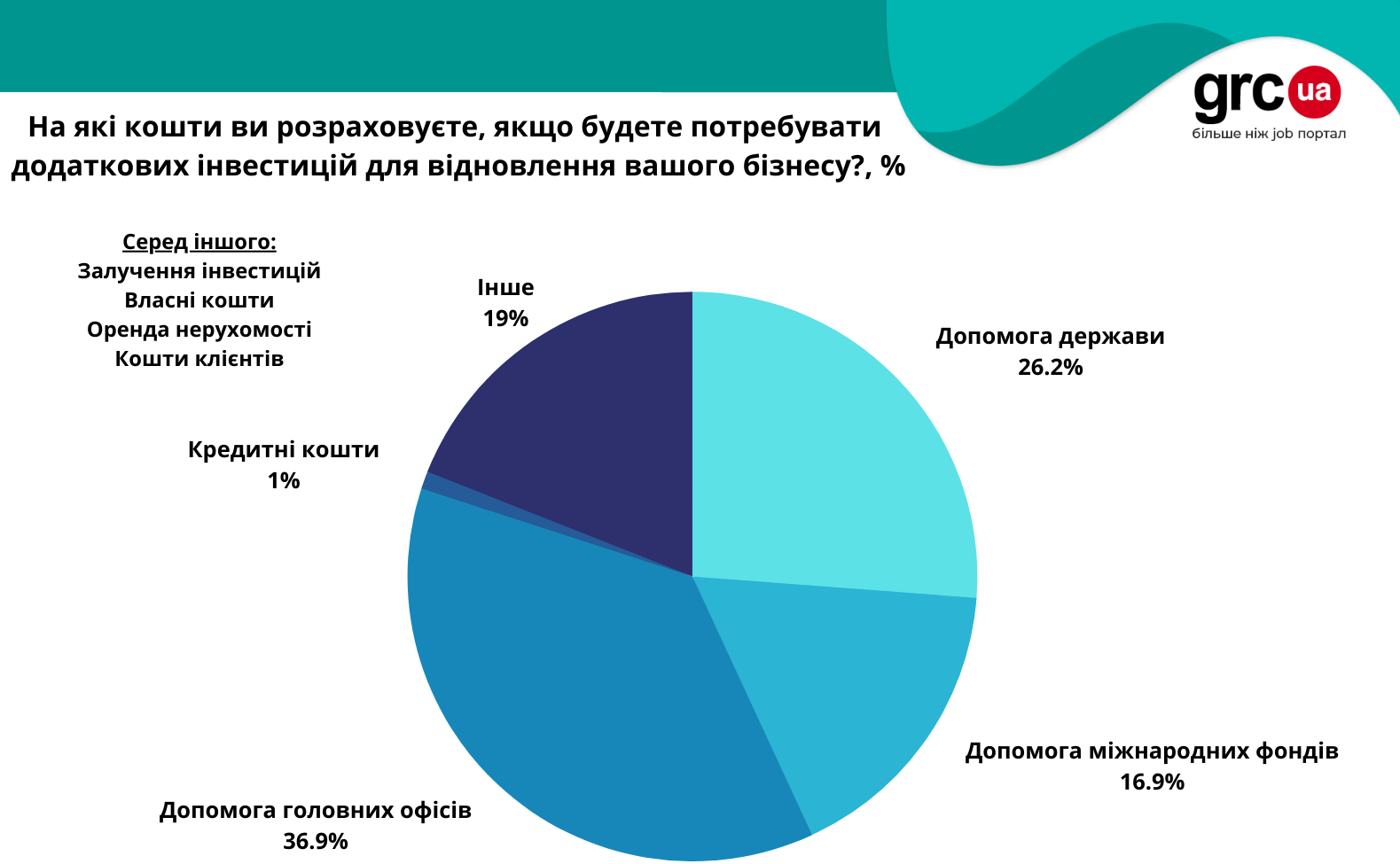 Переважна більшість компаній усвідомлює, що їм не вистачить власних коштів для повноцінного відновлення своєї діяльності. 73% опитаних озвучили, що їм будуть необхідні додаткові інвестиції. Кожна четверта компанія (26,2%) розраховує на державну фінансову допомогу, на кошти міжнародних фондів сподівається 16,9% компаній.