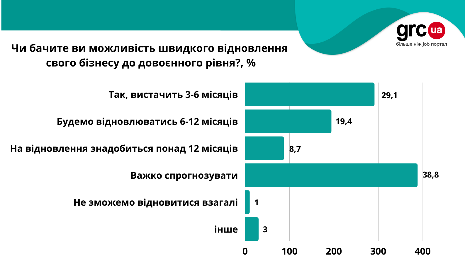 Стримано оптимістичні прогнози стосовно відновлення бізнесу до довоєнного рівня озвучують більш ніж половина компаній. На швидке відновлення, яке триватиме не більше пів року, розраховують 29,1% компаній. Будуть відновлюватись протягом року 19,4% компаній.