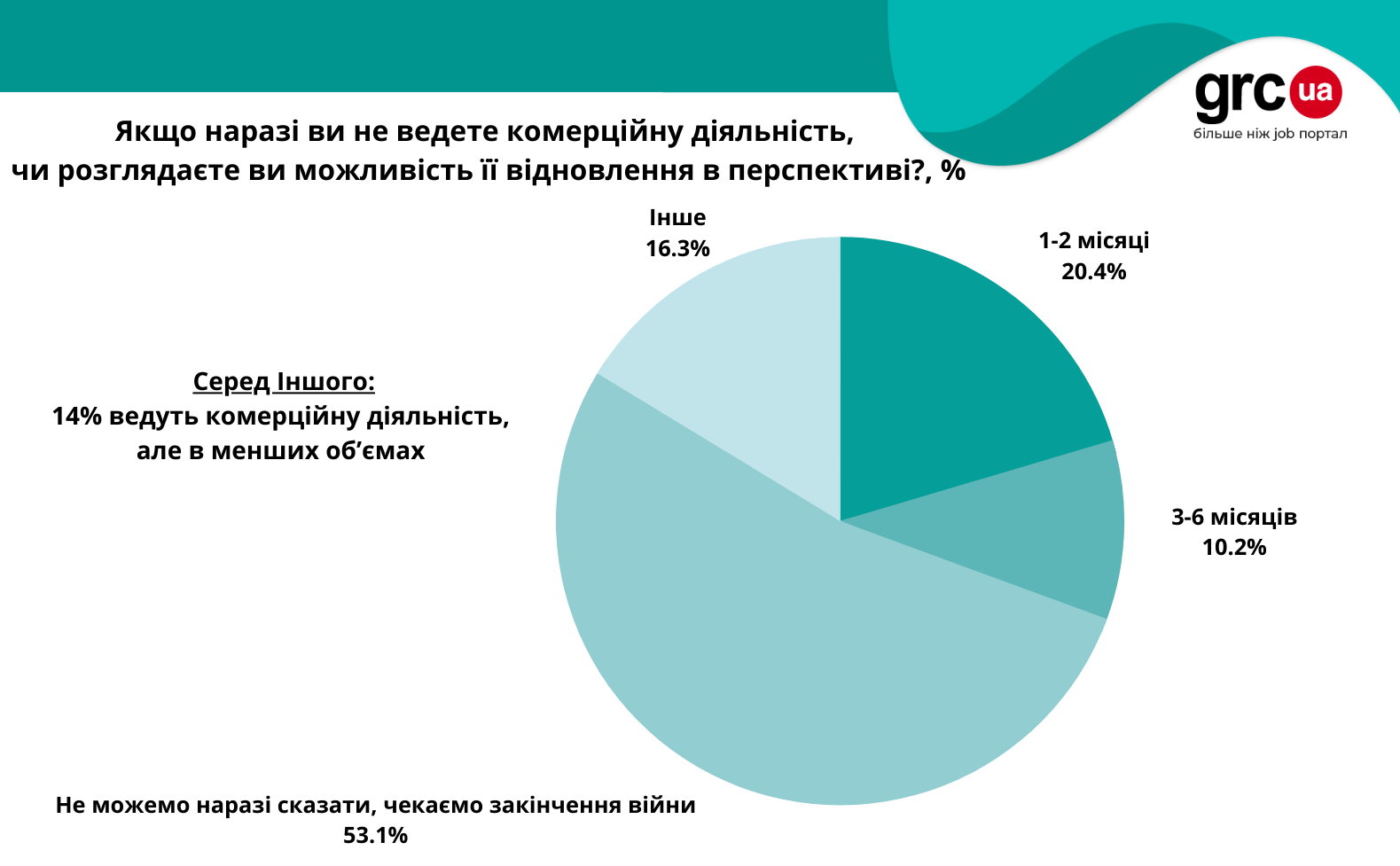Варто зазначити, що компанії, які досі не відновили свою комерційну діяльність, переважно не визначилися зі своїми перспективами. Більша частина (53,1%) компаній з тих, хто зараз не працює, не можуть говорити про відновлення роботи допоки не закінчилася війна. Проте кожна п’ята компанія (20,4%) серед тих, хто поки не поновив комерційну діяльність, розглядає можливість поновлення роботи у найближчій перспективі 1-2 місяці.