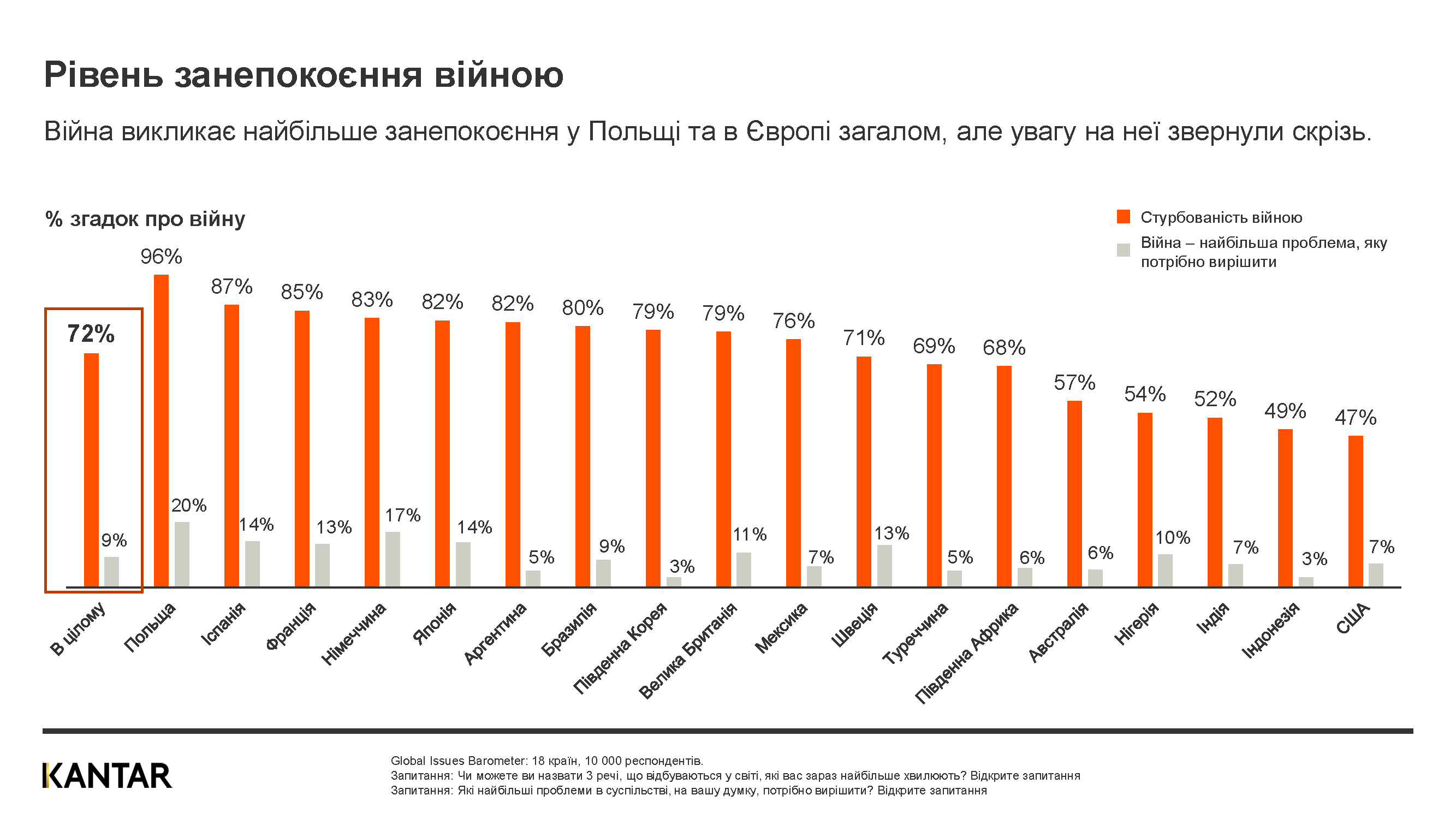 Війна в Україні викликає найбільше занепокоєння у порівнянні з іншими актуальними проблемами у світі, такими як пандемія та інфляційна криза («криза вартості життя»). При цьому війна є нині найбільшим хвилюванням у кожній країні, залученій до дослідження. Про неї згадують не лише у Європі, але також у Південній Кореї та Японії.