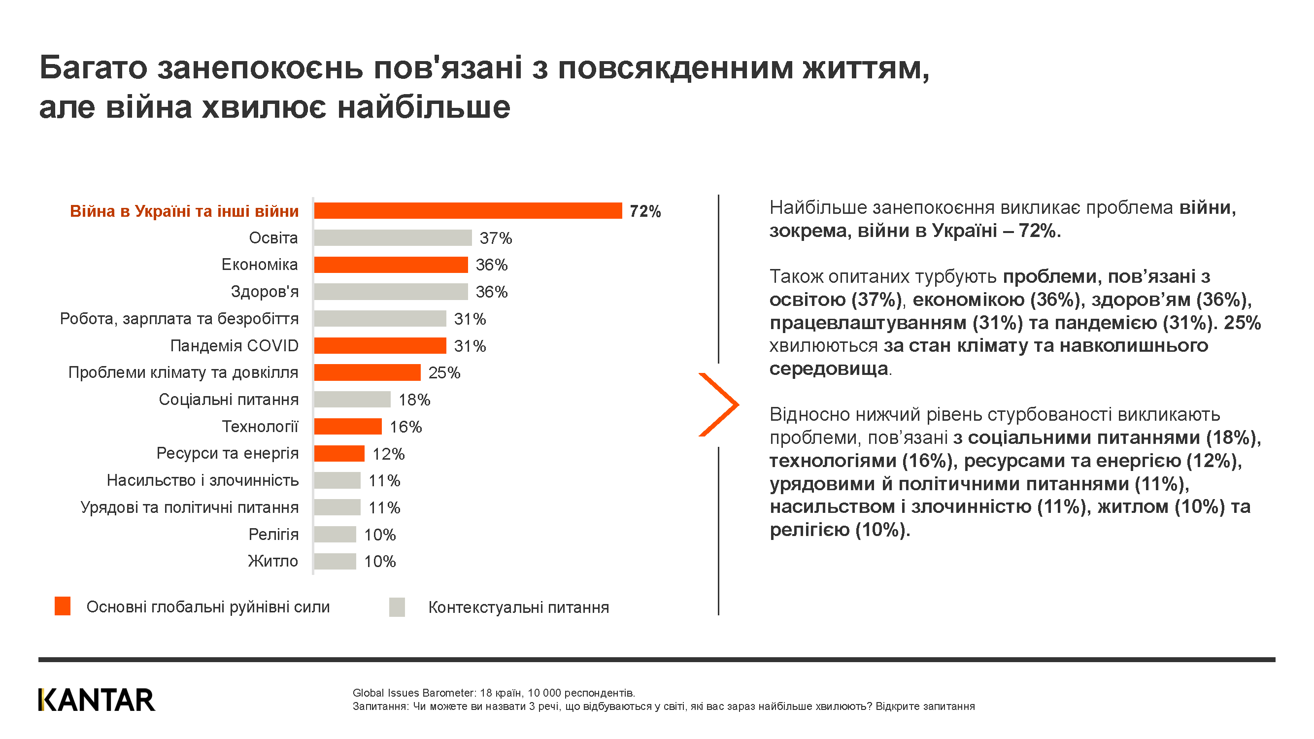 Про це свідчать результати масштабного дослідження «Kantar Global Issues Barometer: світ власними словами», проведеного Kantar серед 10 000 респондентів у 18 країнах світу (57% світового ВВП у 2020 р.). Анкета містила відкриті запитання, аналіз було здійснено з використанням технології штучного інтелекту Kantar TextAI (Intelligent Text Extractor).