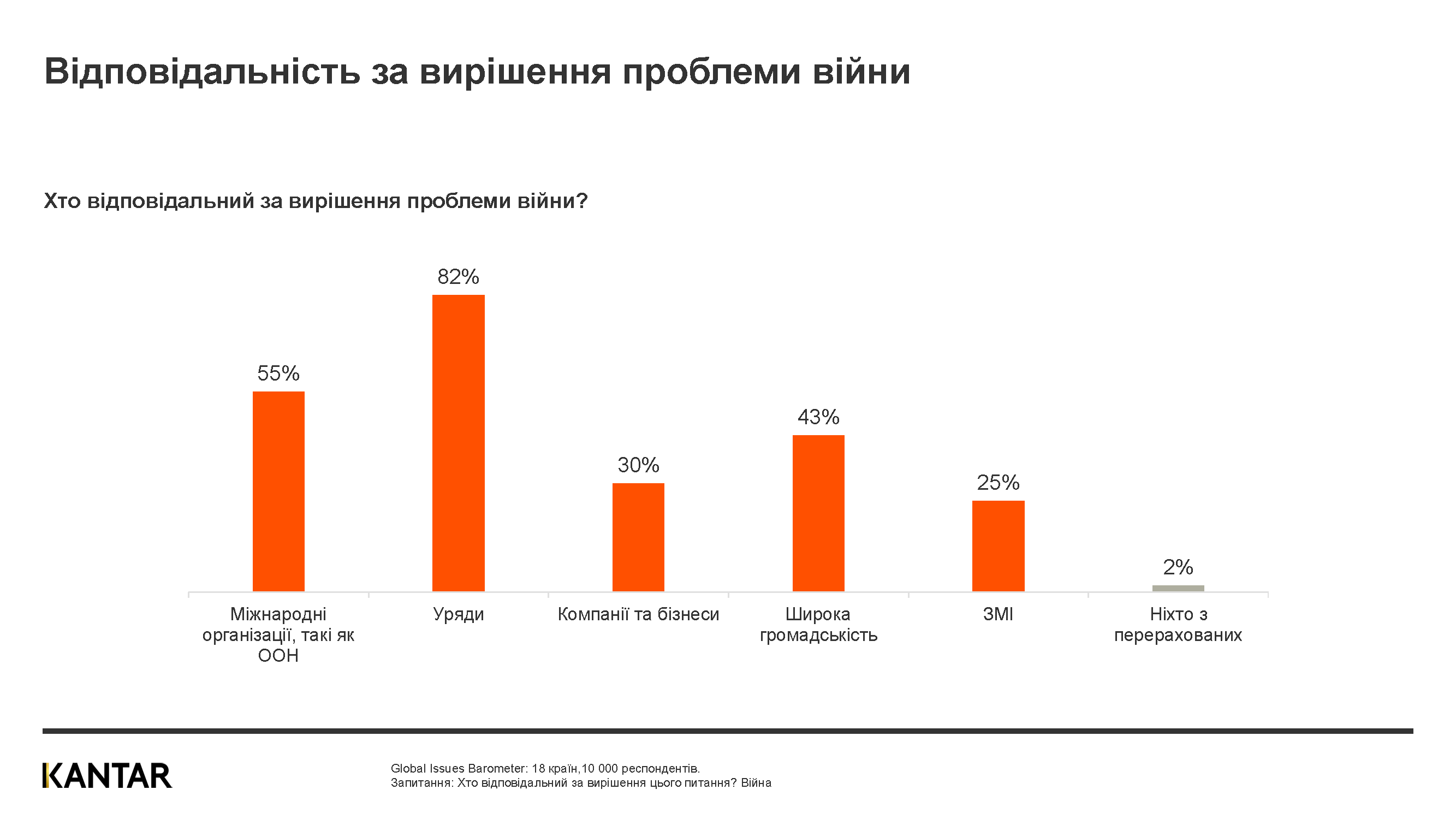Більшість опитаних покладають відповідальність за розв’язання проблеми війн на уряди (82%), значними є також очікування від міжнародних організацій, таких як ООН (55%) та широкої громадськості (43%). 30% сподіваються на дії з боку компаній і бізнесів, 25% — медіа.