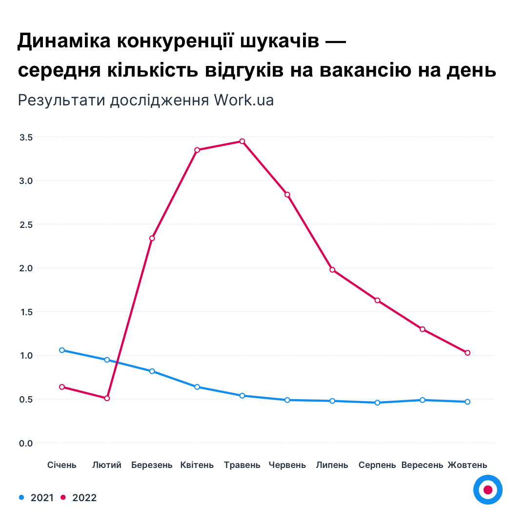 У жовтні ринок праці знову став на крок ближчим до шукача. Середня кількість відгуків на вакансію на день знизилась ще на 21%. Для порівняння, у вересні — на 20%, у серпні — на 18%. Тенденція спостерігається п’ятий місяць поспіль.