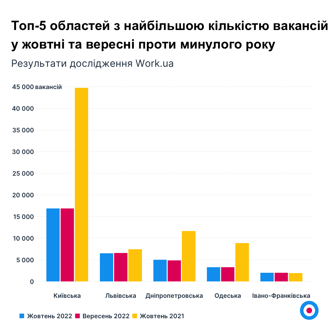За жовтень п’ятірка регіонів із найвищою кількістю вакансій не змінилася і має такий вигляд: