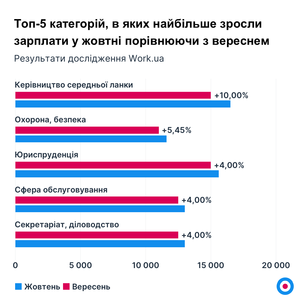 Найнижчі зарплати у жовтні показали часткове зростання: у прибиральників (+2,6% проти вересня) та санітарів — по 8 000 грн, а також в асистента ветеринарного лікаря — 8 125 грн.
