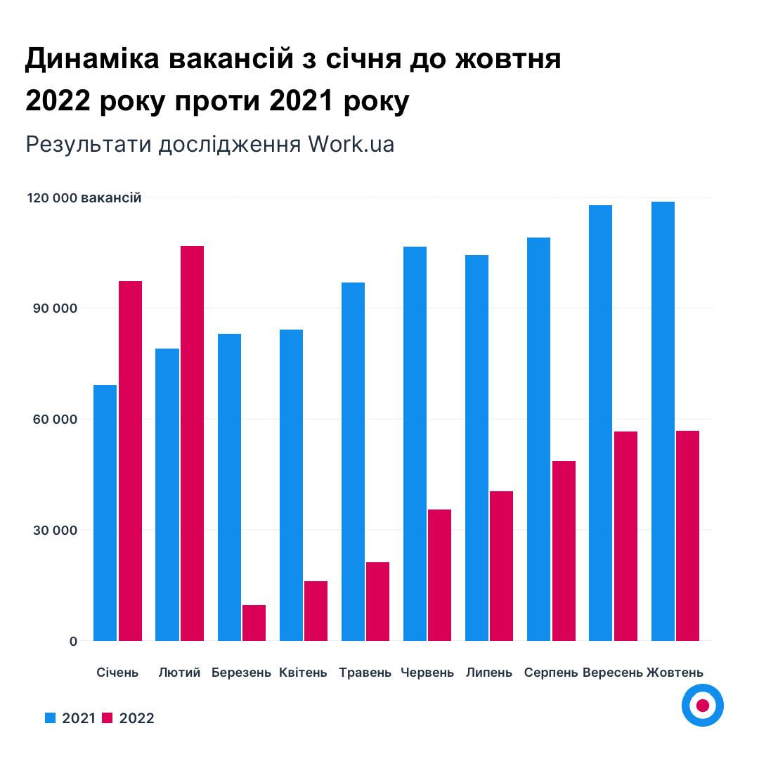У жовтні максимальна кількість вакансій, які були розміщені на Work.ua, залишилася на рівні попереднього місяця — 56 719 проти 56 554 вакансій. Падіння не відбулось. Зростання склало 0,3%, при тому, що у вересні приріст був 16%, у серпні — 20%.