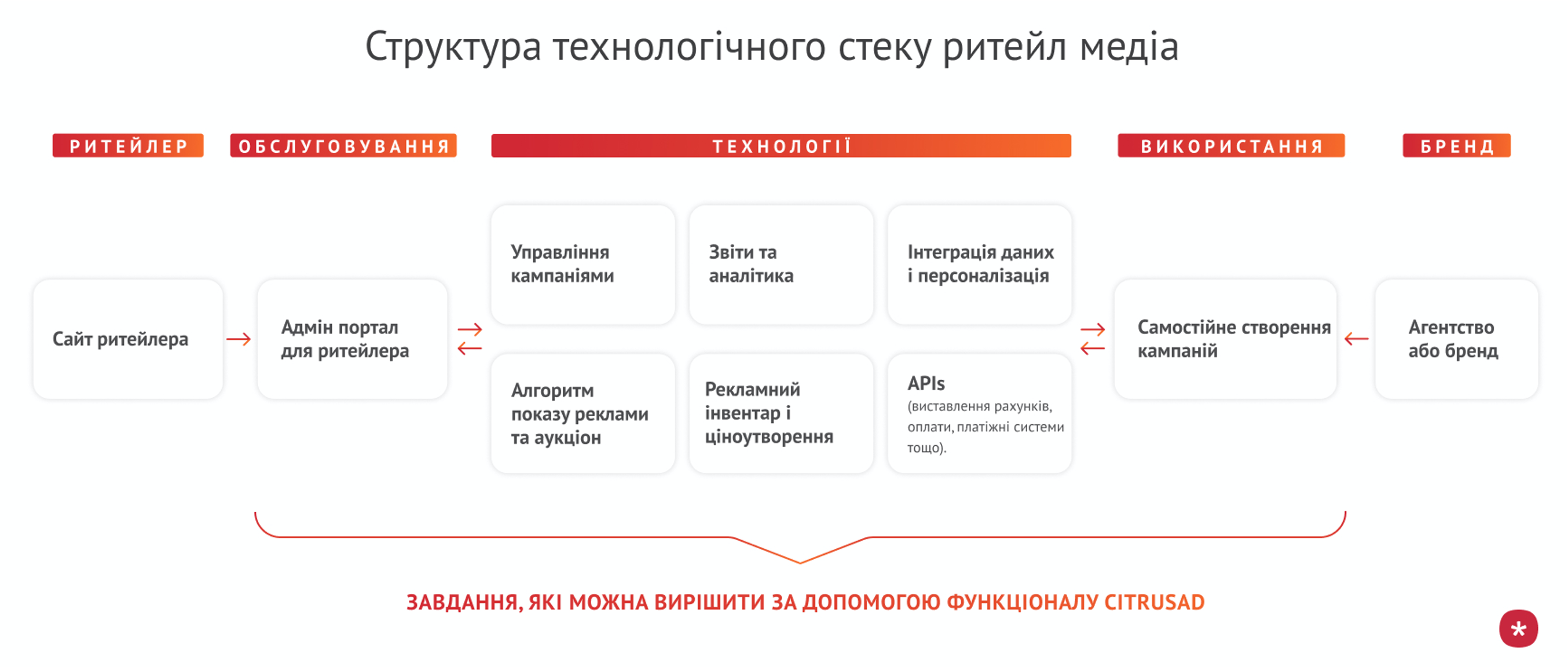 З графіка видно, як різні гравці e-commerce сфери взаємодіють між собою за допомогою ритейл медіа платформи. Слово «технологія» часто звучить занадто узагальнено, але воно має за собою широкий функціонал, який дозволяє виконувати, автоматизувати та полегшувати цілу низку завдань та функцій. Наприклад, технологія CitrusAd дозволяє налаштовувати та керувати рекламними кампаніями в одному інтерфейсі, інтегрувати у платформу будь-які дані, отримувати аналітику та автоматизувати створення звітів.