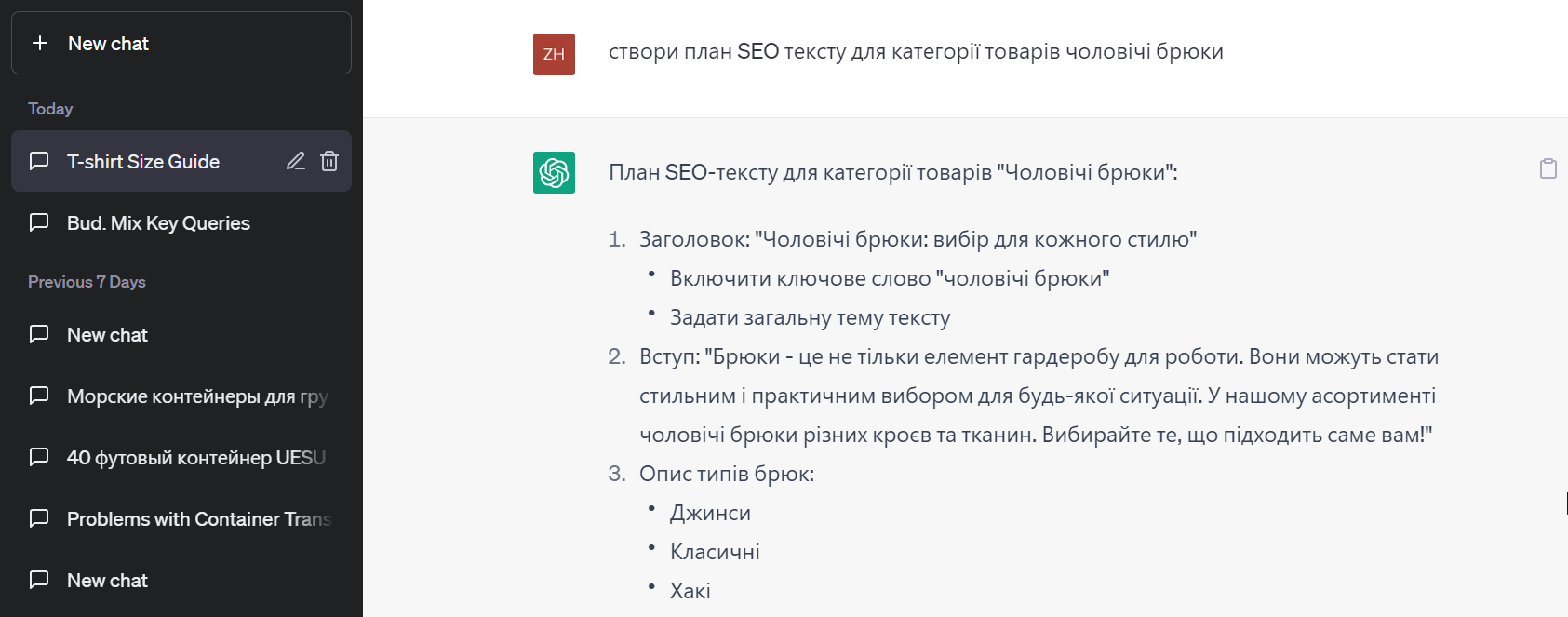 У розв’язанні задачі допоможе ChatGPT. Наприклад, вам треба написати максимально інформативний текст для категорії товарів. Для цього попросіть ChatGPT скласти план: