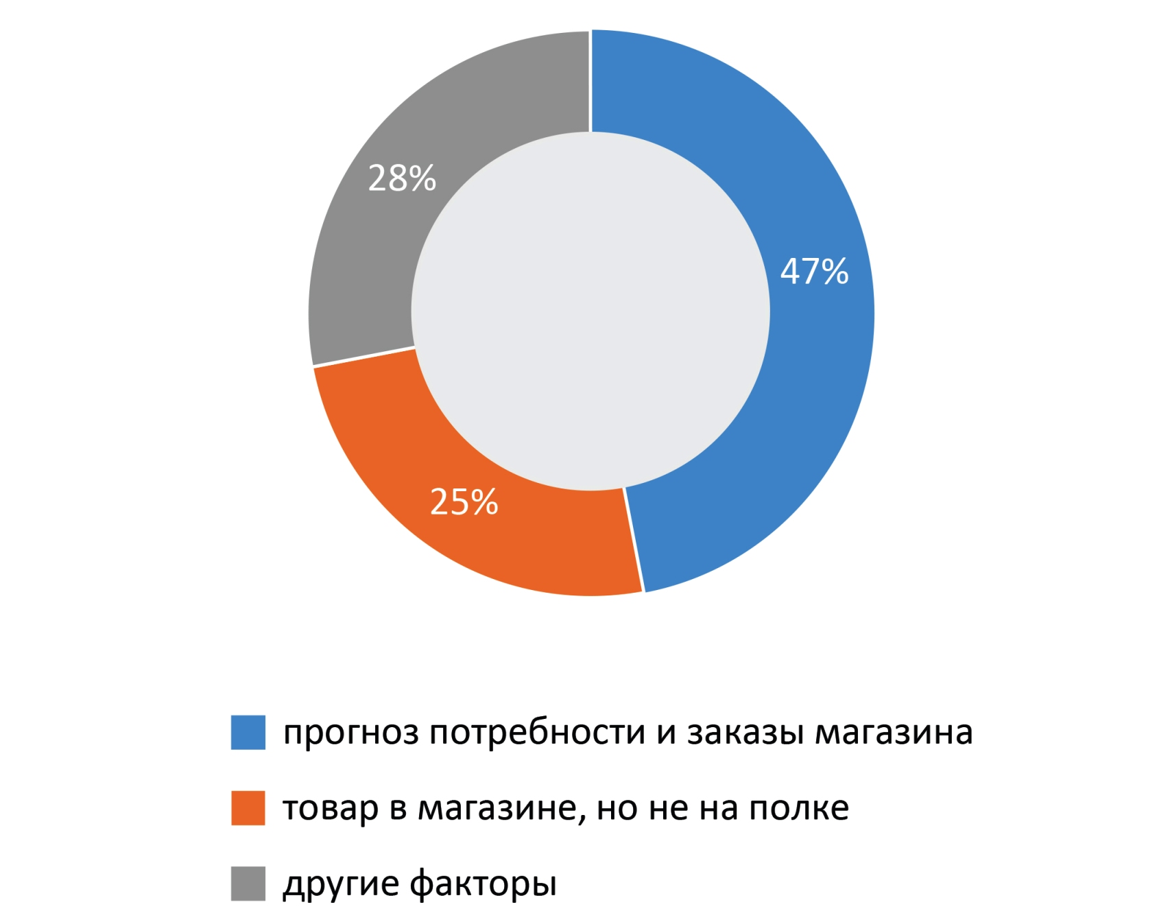 Близько 75% ситуацій OOS обумовлені внутрішніми процесами торгових мереж та ще близько 25% — зовнішніми факторами, переважно постачальниками. Нижче наведено причини нестачі товару на полиці.