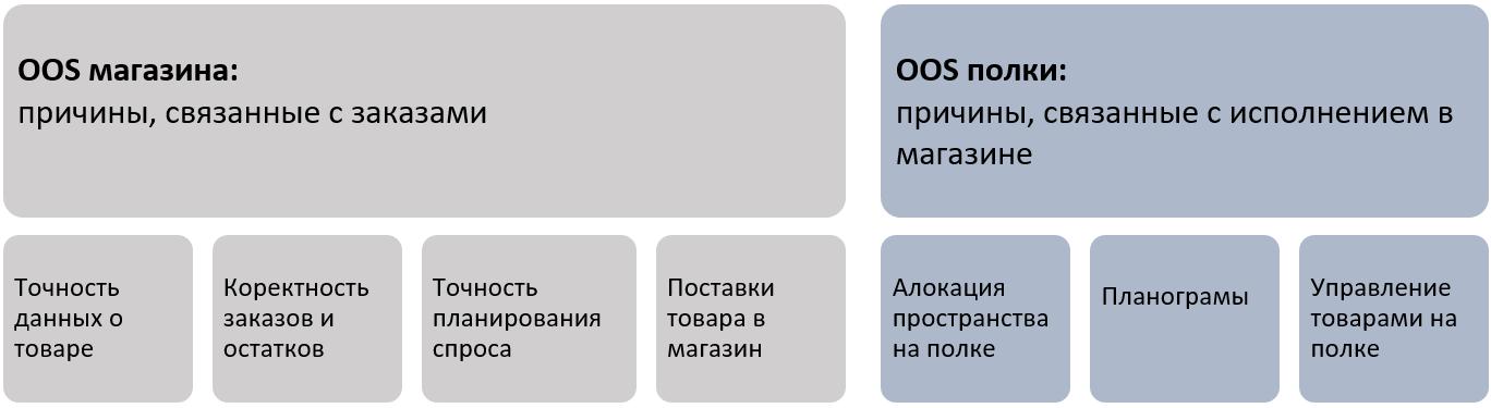 б) причини, повʼязані з виконанням у магазині, які впливають на OOS полиці.