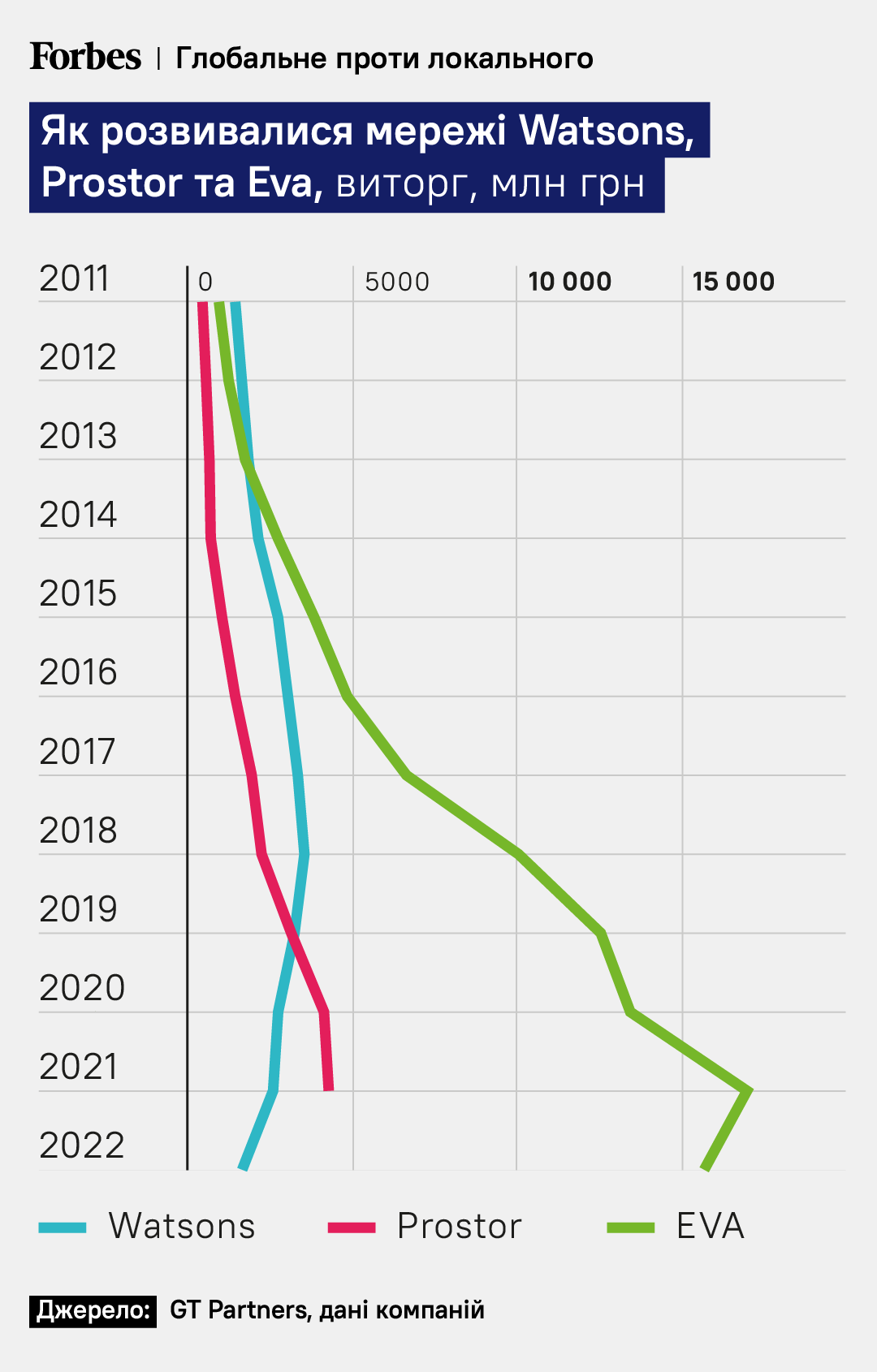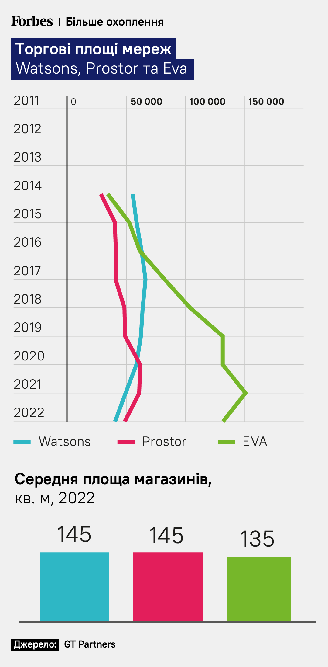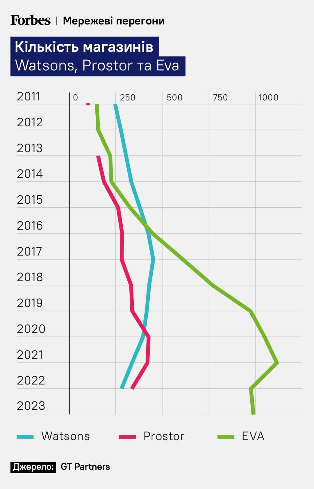 Проте Watsons фактично заморозила офлайн‐експансію. За даними GT Partners, за два роки пандемії мережа не відкрила жодного магазина, а EVA розширилася на 165 — більш як до 1100 магазинів. 2021 року Watsons із 337 магазинами спустилася вже на третє місце. Її обігнала компанія Prostor, яка виросла до 420 магазинів, придбавши мережу «Космо».