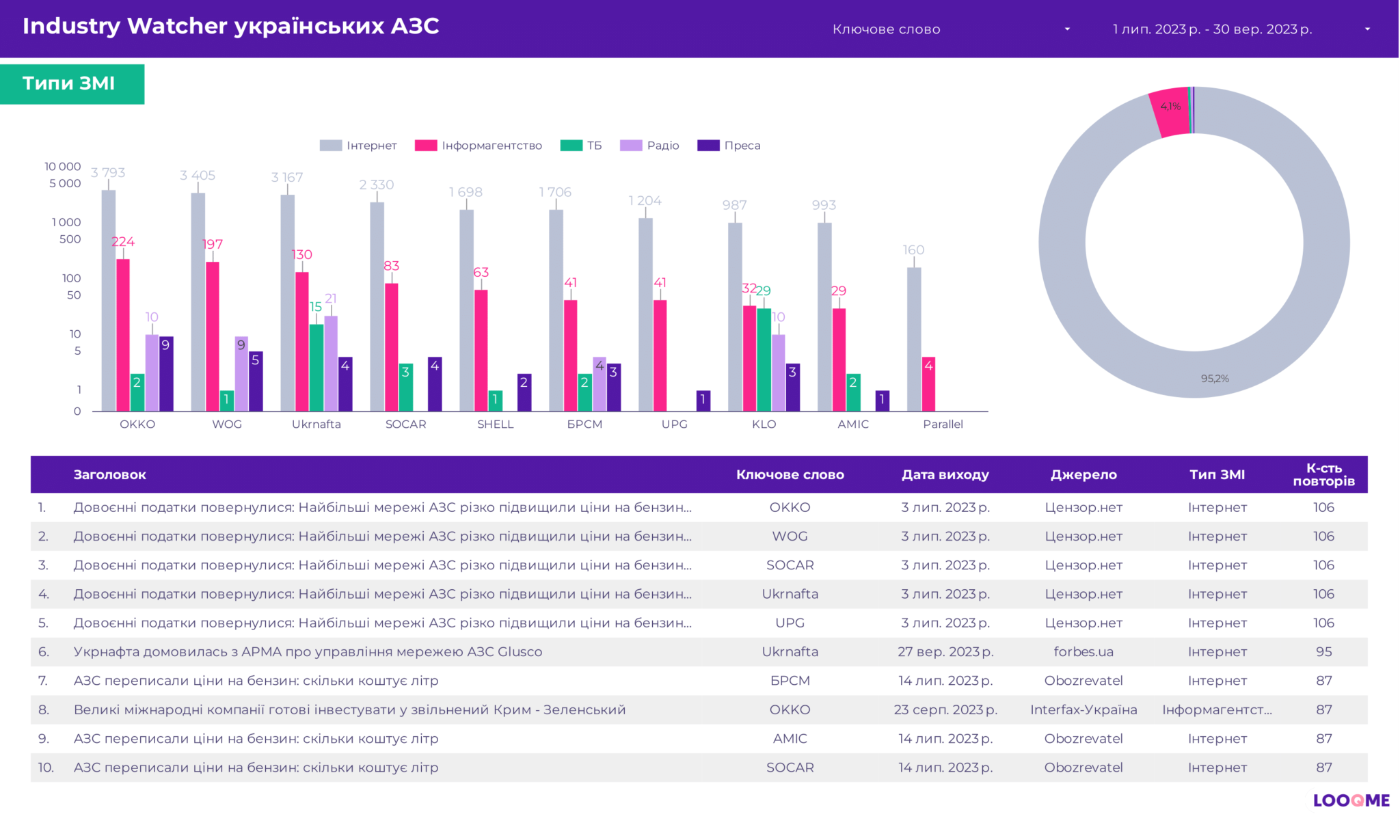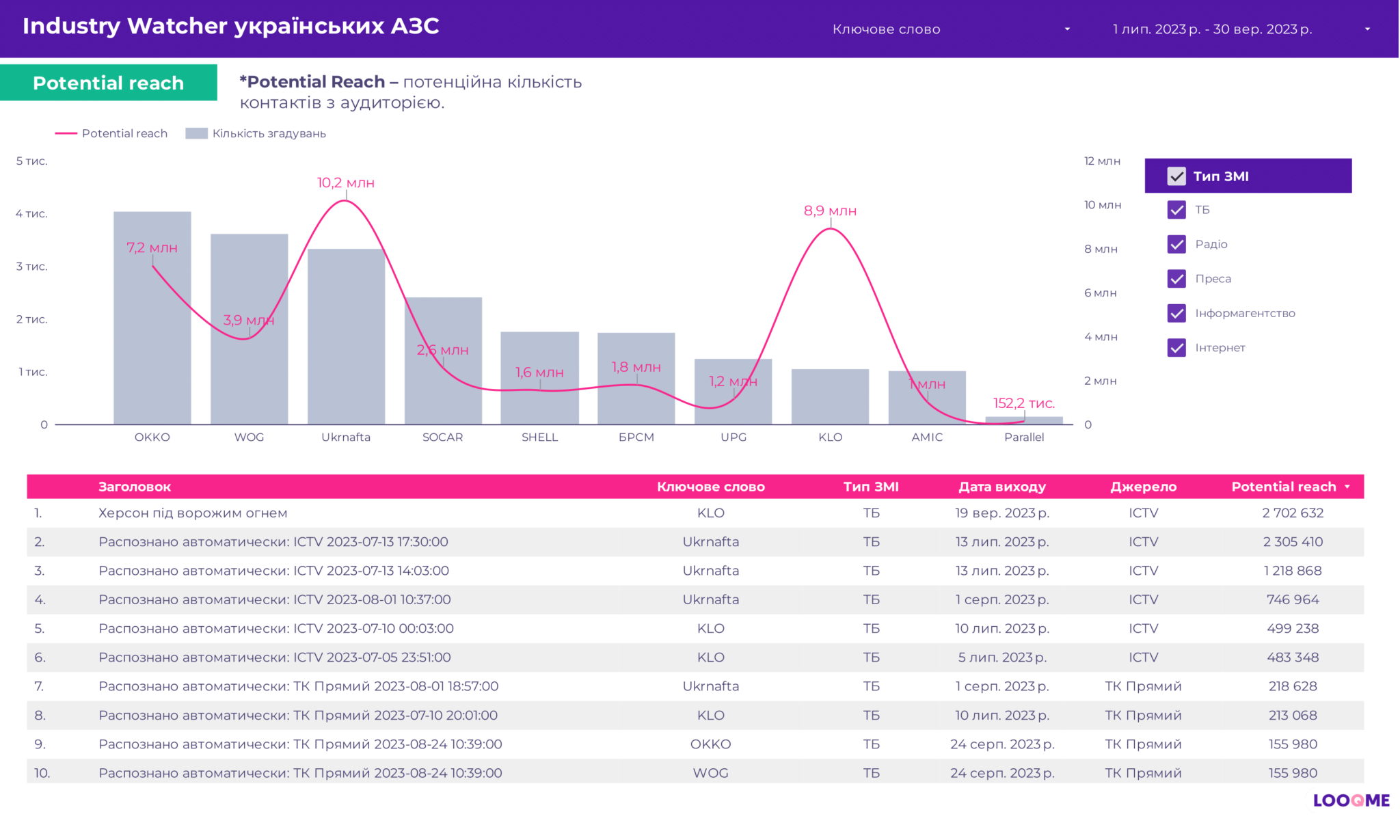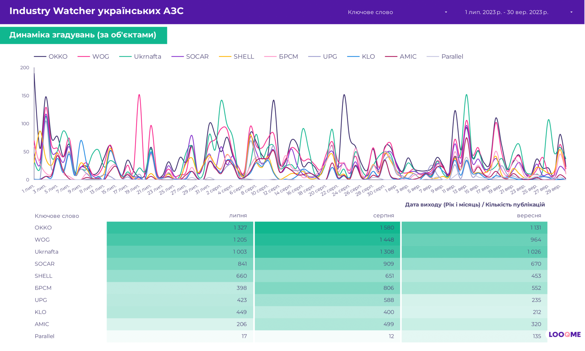 Пальне — запорука руху автомобіля, а комунікації — це пальне для розвитку компаній. Українські АЗС достатньо активні у комунікаціях, тож LOOQME спільно з Ukrainian Business Award дослідили, що і як говорили ЗМІ про найбільші українські паливні компанії. Аналізували такі компанії: ОККО, WOG, Ukrnafta, SOCAR, SHELL, БРСМ, UPG, KLO, AMIC, Parallel.