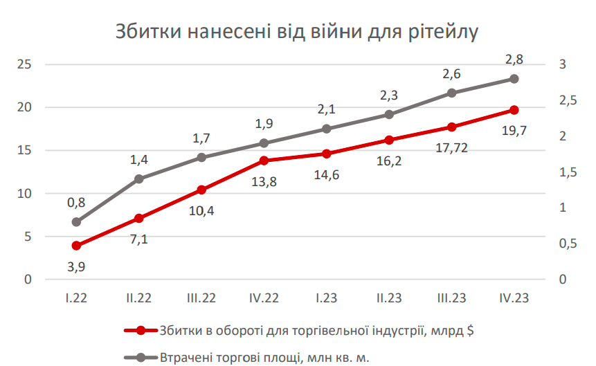 Ритейл за період війни недоотримав 20 млрд доларів обороту. Крім того, через військові дії було пошкоджено приблизно 3 млн кв. м торгових площ по всій території України. Більшість ТРЦ вже повністю відновили роботу та адаптувалися до умов, а населення частково повертається в Україну.