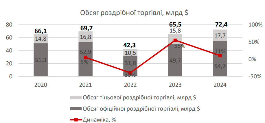 У 2022 році обсяг продажів в ритейлі знизився, втім, незважаючи на геополітичні умови у 2023 році, обсяг продажів відновився та вже наблизився до довоєнних показників.