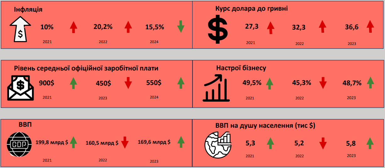 У показниках інфляції фіксується стабільне зниження після зростання у 2022 році, що було спровоковано воєнним вторгненням та руйнуванням інфраструктури/логістичних маршрутів. В наступні роки прогнозується повернення інфляції на оптимальні 5-6%.