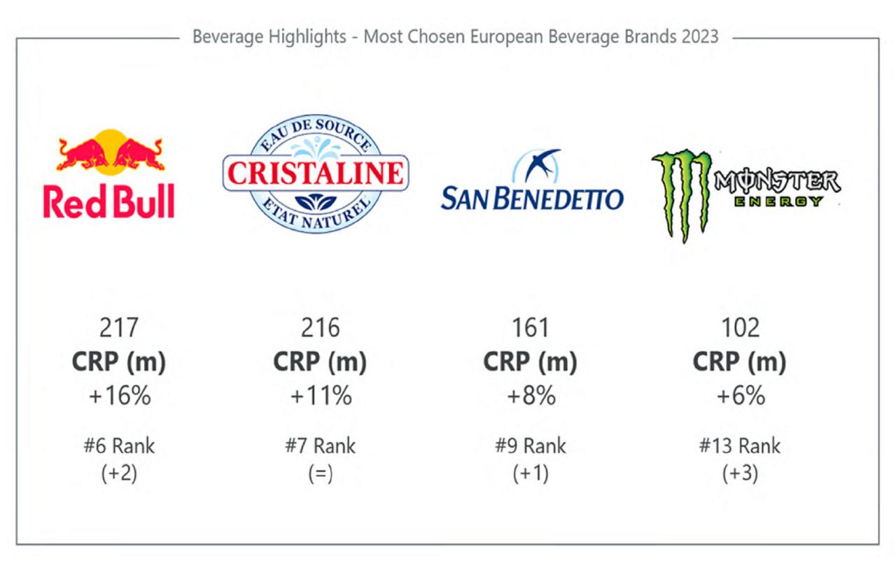 Переможці у сегменті енергетичних напоїв — Red Bull та угорський HELL. Глобально Red Bull зміг подвоїти свій вплив, додавши 13 мільйонів нових покупців. У Європі австрійський енергетичний напій посідає 6-е місце у категорії напоїв, піднявшись на 2 позиції зі зростанням CRP на 15,5% та плюсом 6% у проникненні.
