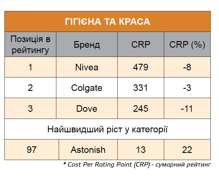 Список ТОП-10 товарів для особистої гігієни та краси майже залишився без змін. Лідером залишається бренд Nivea, за яким слідують Colgate та Dove. Серед переможців у цій категорії відзначено косметичний бренд Essence, який піднявся на п’ять позицій до 25-го місця з 18,2% зростанням у CRP та плюс 5,3% у проникненні. Зубна паста Parodontax, що займає 42-е місце, показала зріст на 6,4% у CRP та збільшила своє проникнення на 2,7%.