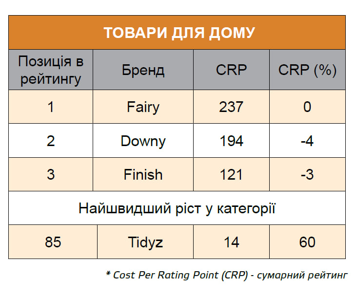 Топ-10 у домашньому догляді практично не змінився: бренд Fairy залишається на першому місці. Італійська компанія, що виробляє паперові серветки Foxy, здобула 10-те місце серед лідерів категорії з ростом у CRP на 4,2% і збільшенням проникнення на 4,7%.