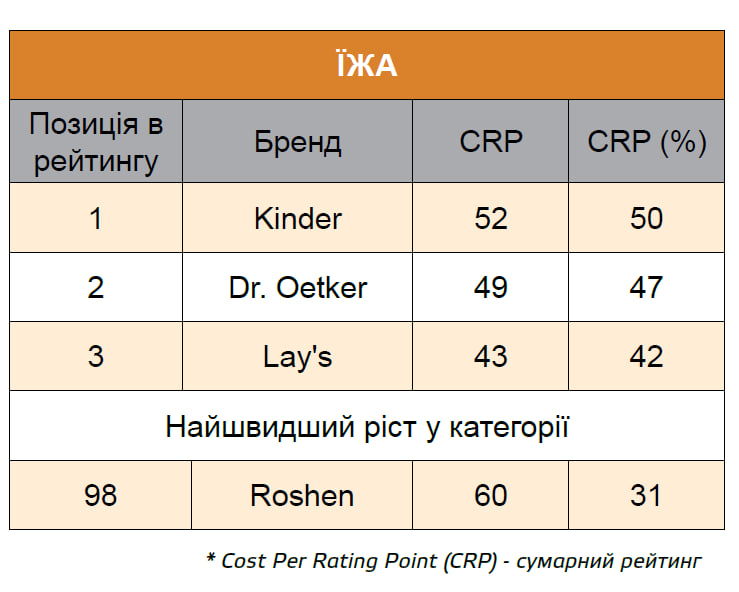 Kinder надалі займає лідерські позиції в категорії продуктів харчування, утримуючи друге місце в Європі серед усіх брендів і категорій. Вони змогли розширити свій CRP на 3,8%. Окрім того, Milka (4 місце) та Knorr (5 місце) помінялися місцями.
