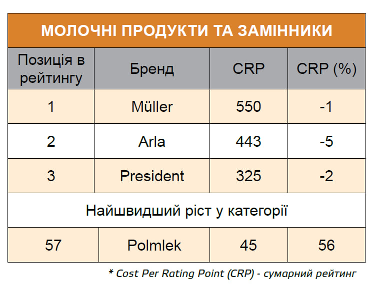 У рейтингу найпопулярніших брендів молочних продуктів та замінників молока перша трійка лідерів лишається незмінною: Müller лідирує в цій категорії, за ним йдуть Arla та President.
