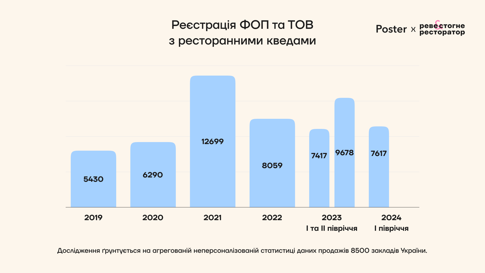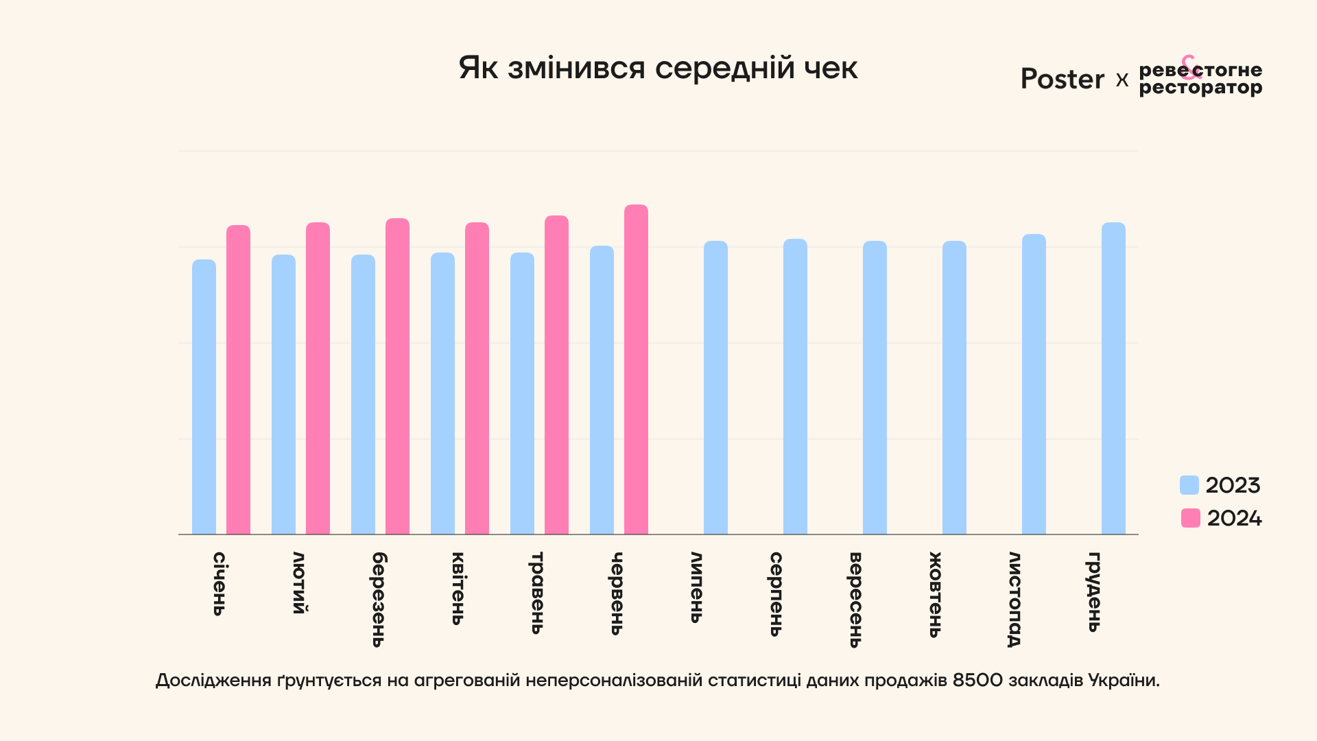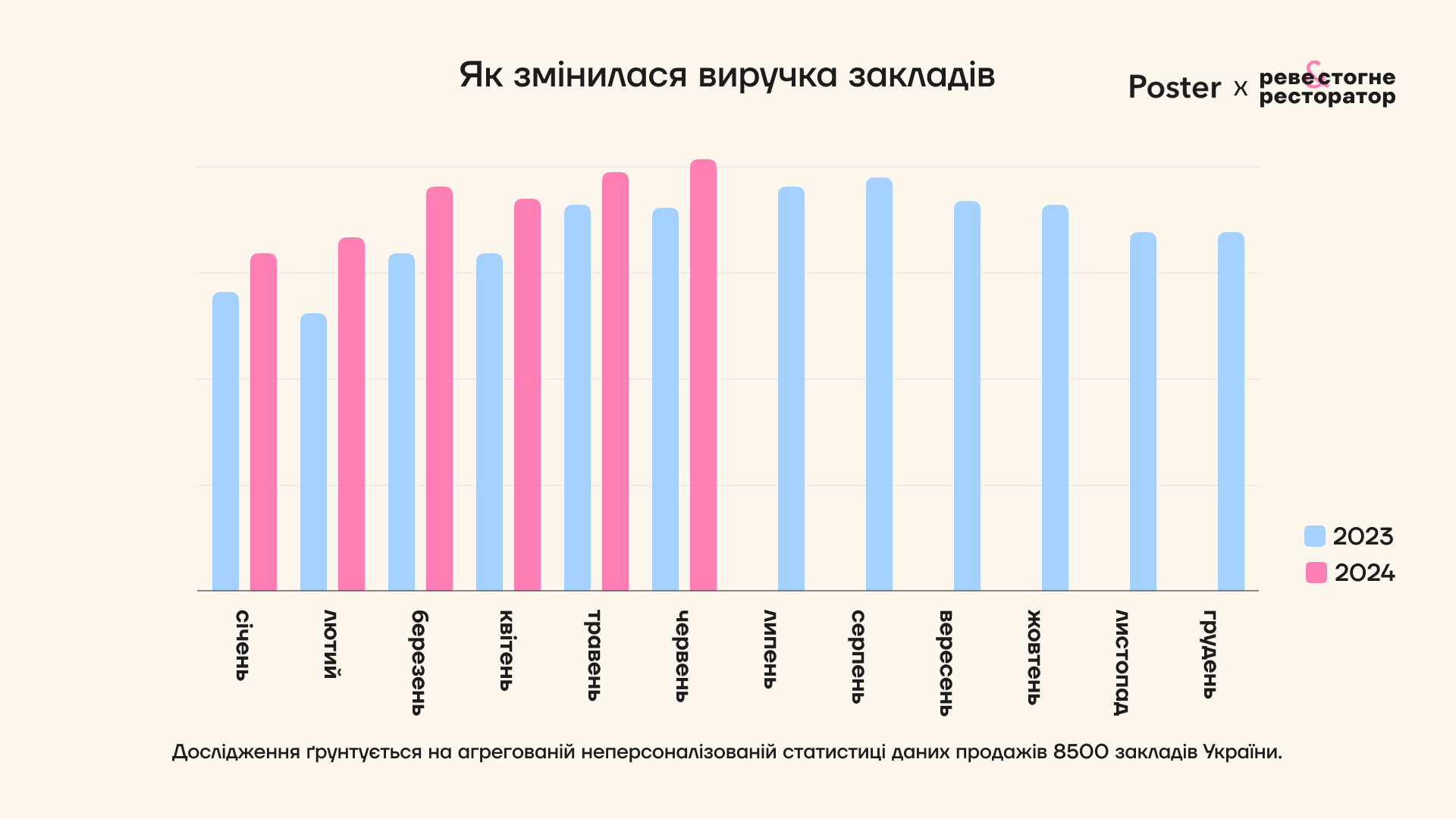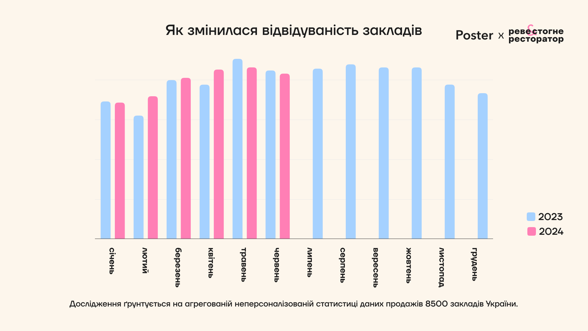 Дослідження ґрунтується на неперсоналізованій агрегованій статистиці даних продажів Poster. Когорта – 8500 закладів громадського харчування всіх типів зі всіх регіонів України, які працювали протягом всього періоду дослідження.