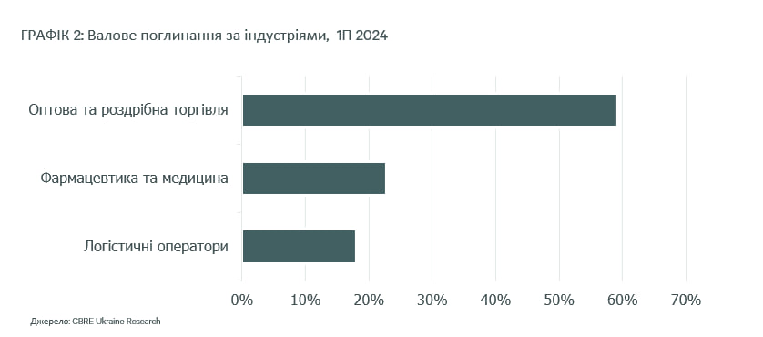 Як і раніше, в структурі валового поглинання домінував сектор оптової та роздрібної торгівлі (59%), за ним слідує сектор фармацевтики та медицини (23%), що продемонстрував зростання на 16,6 п.п. з початку року. Водночас частка логістичних та 3PL операторів (18%) продовжувала знижуватися, скоротившись приблизно удвічі, порівняно з аналогічним періодом 2023 року.