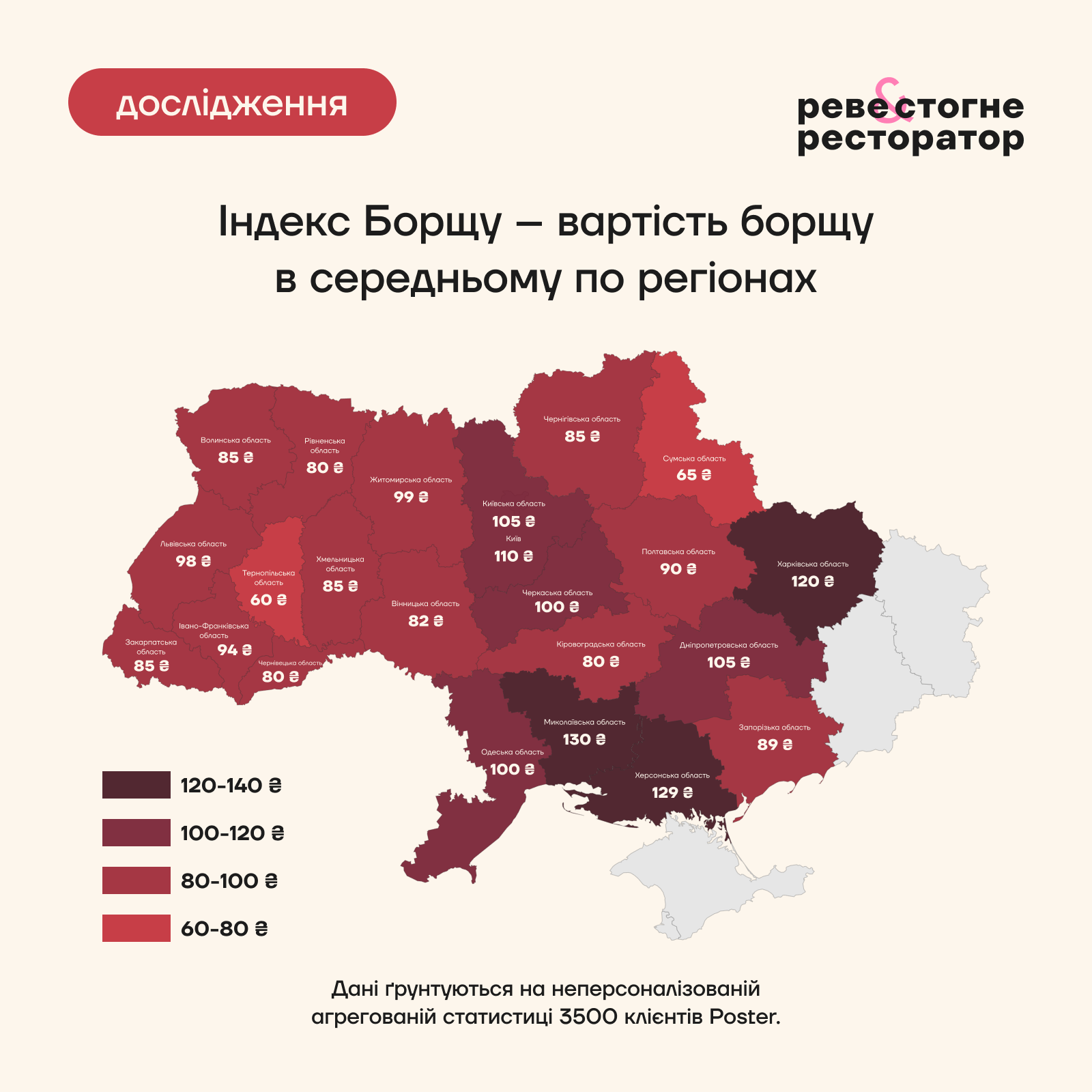 Найдорожче тарілка борщу коштує у закладах Миколаївщині (130 грн) та Херсонщині (129 грн), слідом йдуть Харківщина (120 грн) та місто Київ (110 грн). Натомість найнижчі ціни на українську страву на Тернопільщині (60 грн) та Сумщині (65 грн).