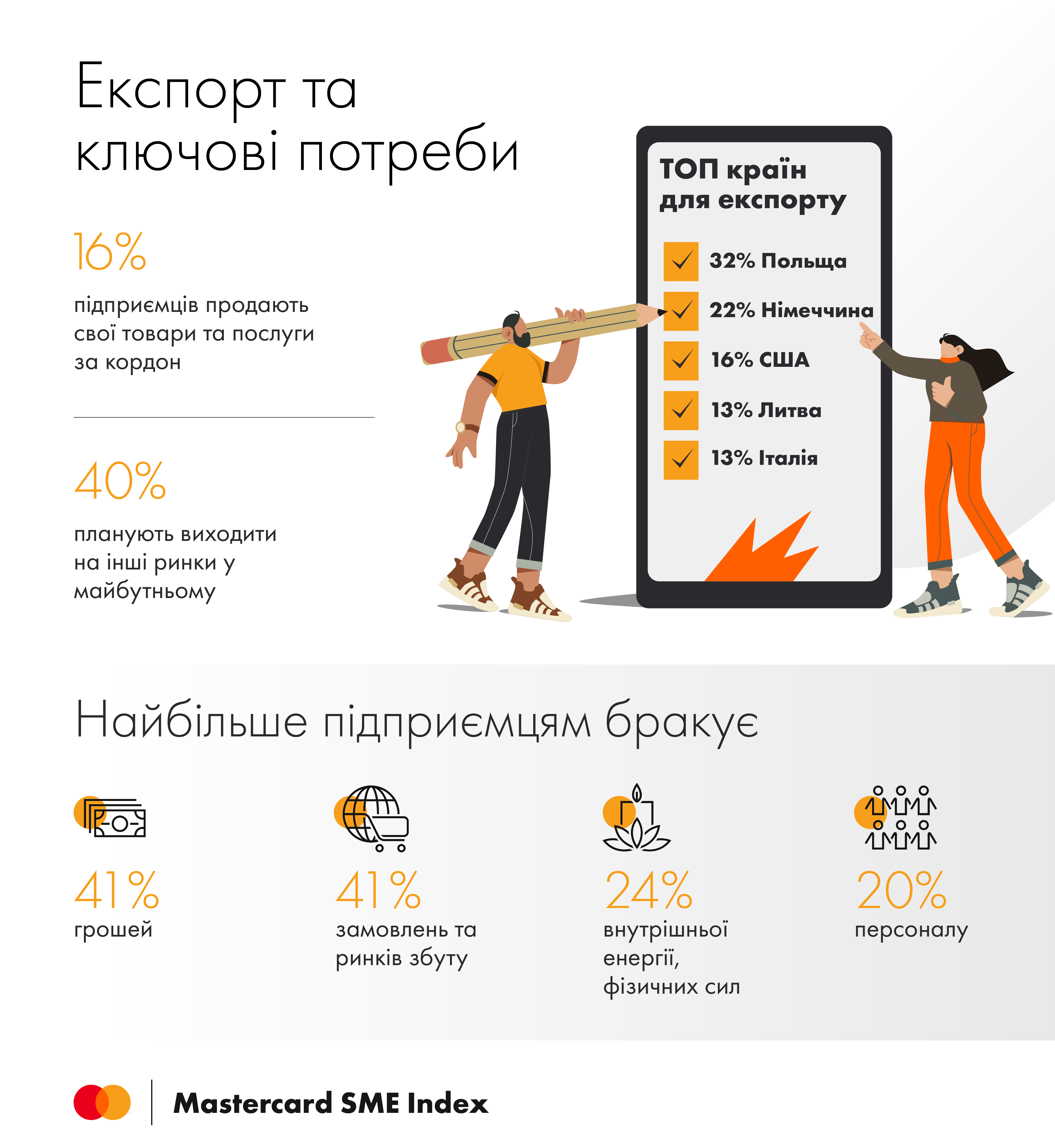 Одним з головних способів масштабування українські підприємці називають розвиток експорту. Кожен шостий респондент (16%) вже продає свої товари або послуги за кордон, а ще 40% планують виходити на закордонні ринки. Найбільш популярними країнами для експорту стали Польща (32%), Німеччина (22%), США (16%), Литва й Італія (по 13%).