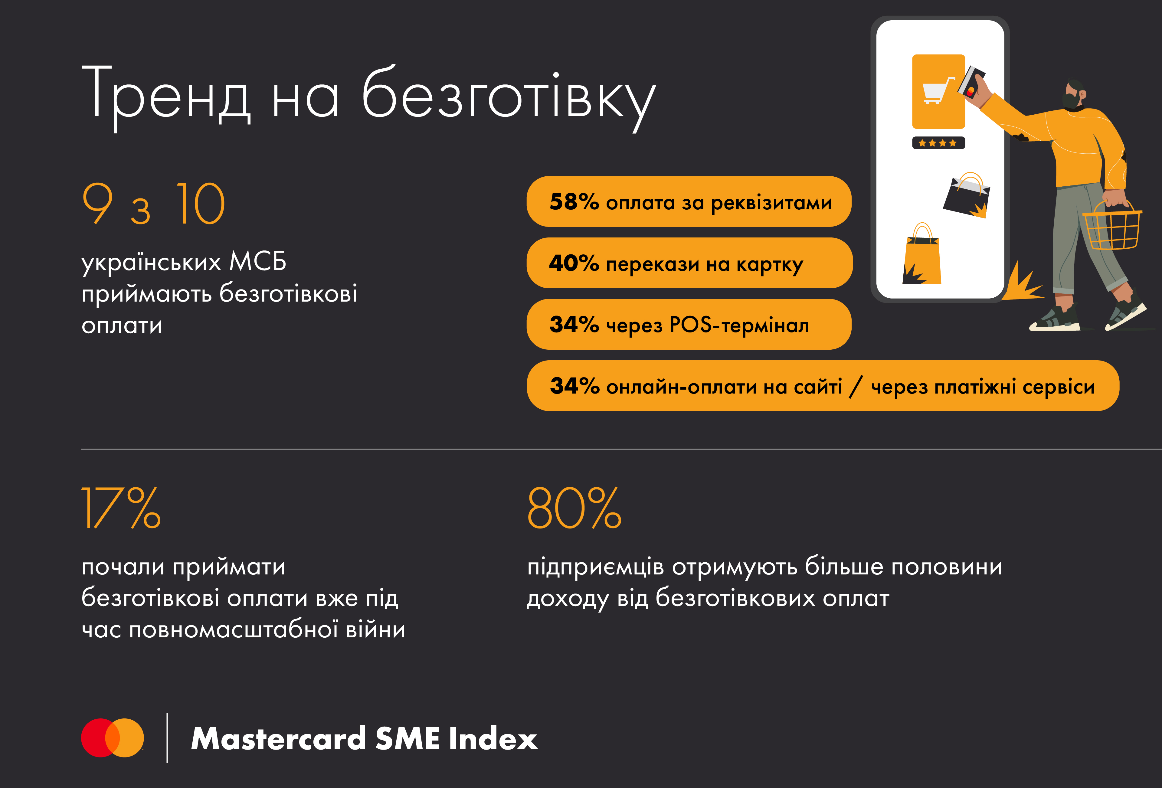 Сьогодні 9 з 10 українських МСБ надають можливість розрахуватися за товари чи послуги безготівково, 17% з них почали приймати такі форми розрахунків упродовж останніх двох років. Варто зазначити, що для 80% підприємців безготівкові оплати приносять більше половини доходу — це на 8 в.п. більше, порівняно з попереднім роком.