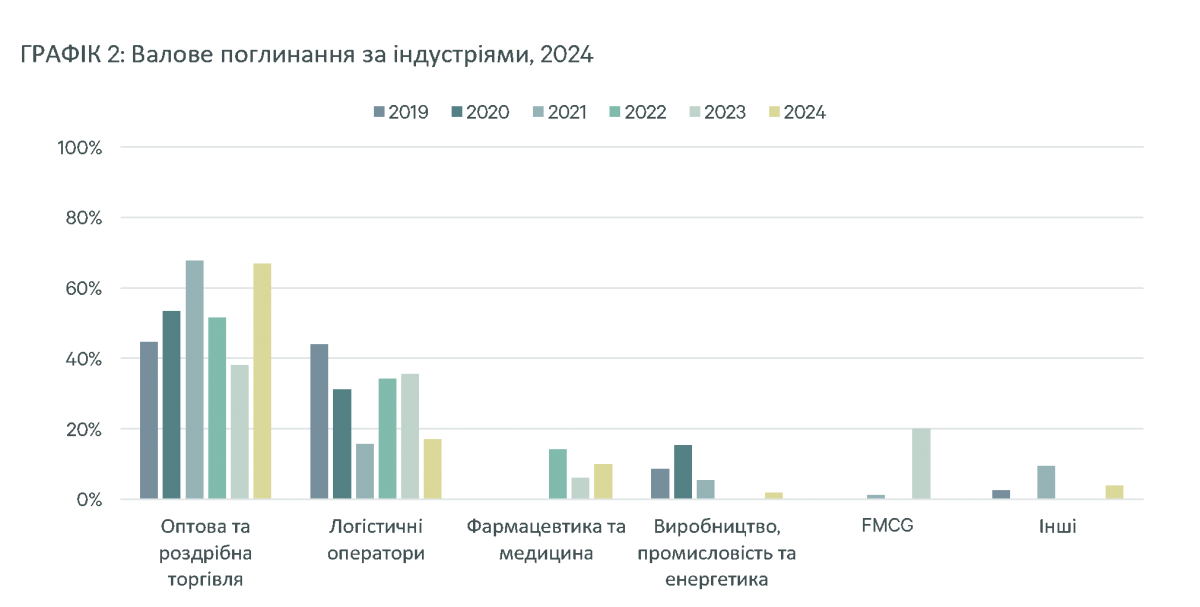 Станом на кінець 2024, сектор оптової та роздрібної торгівлі домінував в структурі валового поглинання з часткою 67% (+33 п.п р/р), за ним слідували 3PL оператори з часткою 17% (-19 п.п. р/р). Варто зазначити, що фармацевтичний сектор збільшив свою частку в загальній структурі поглинання до 12% у 2022-2024 роках після того, як був практично не приставленим в орендній структурі у 2019-2021 роках. Фармацевтичні компанії дедалі більше розвивають власні складські потужності, менше покладаючись на послуги сторонніх дистриб’юторів, що відображає загальну тенденцію до посилення контролю над ланцюгами постачання та підвищення операційної гнучкості в умовах викликів, пов’язаних із війною.