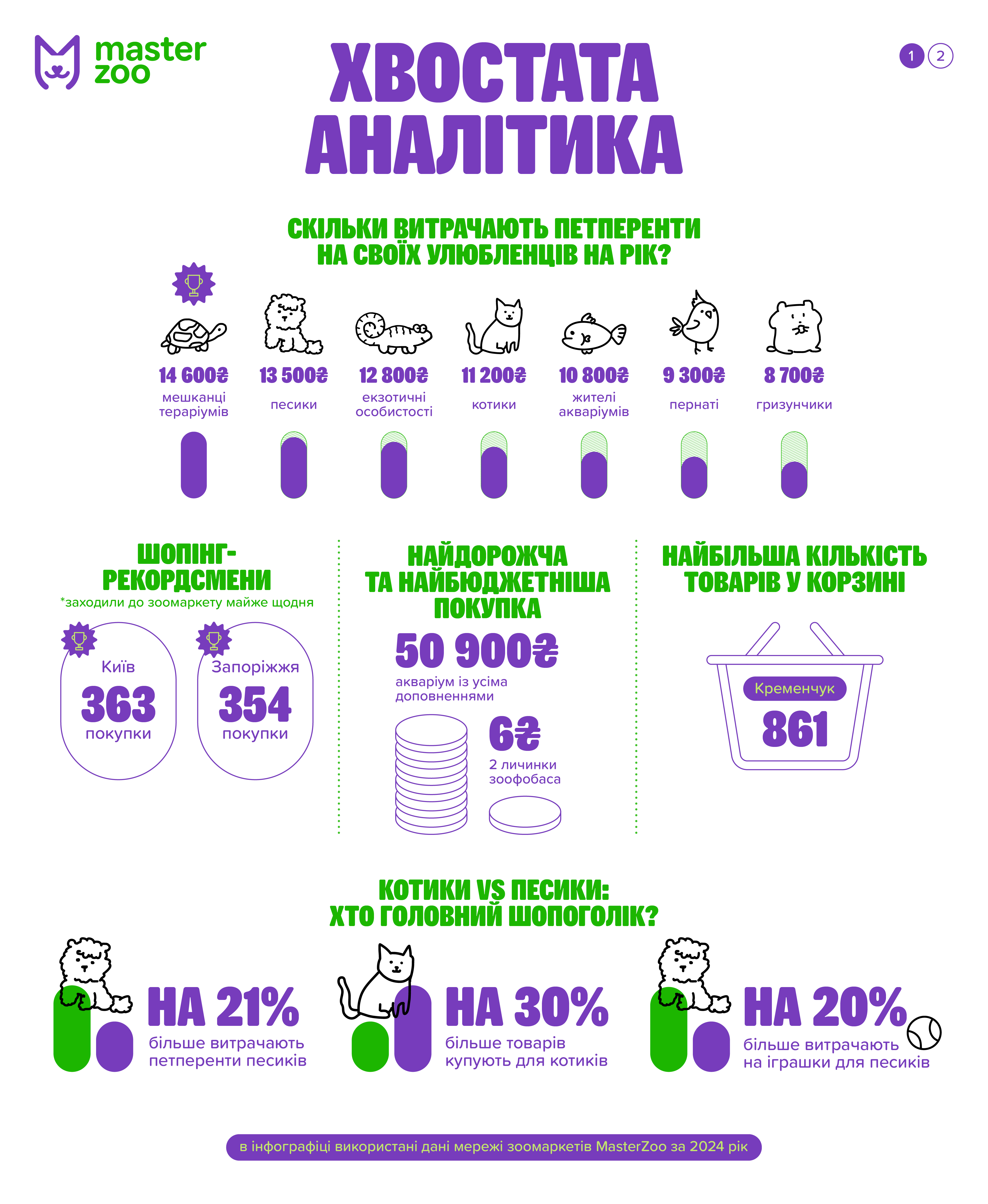 У інфографіці мережа ділиться інсайтами про те, які улюбленці мешкають у домівках українців, про рекордні розміри покупок, різницю у витратах на котів і собак, і товари бестселери. Для підготовки були використані власні дані MasterZoo за 2024 рік.