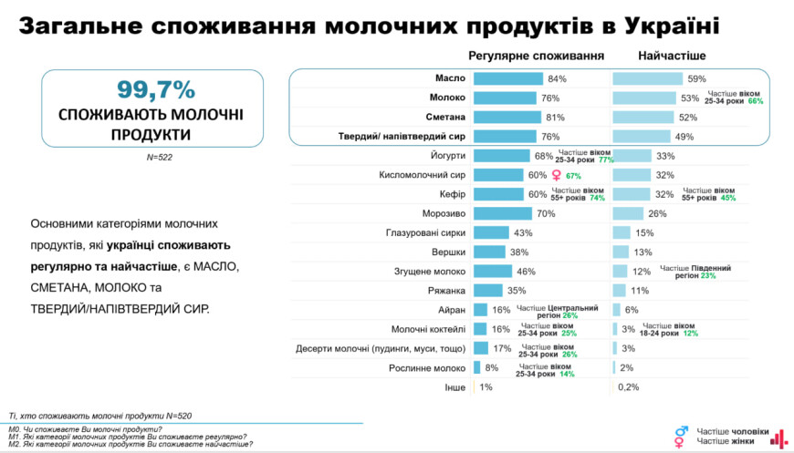 Дослідження 4Service, проведене у 2025 році серед 522 респондентів, показало: 95% українців регулярно споживають молочні продукти, найчастіше — масло, сметану, молоко та твердий сир. Це — частина культурної звички, сформованої ще з дитинства.