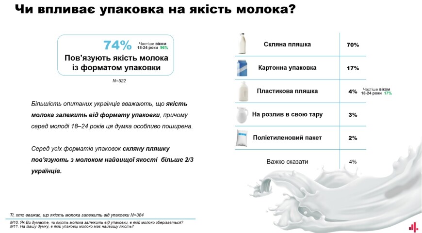 Для українців упаковка стала маркером якості: 74% споживачів вважають, що саме від формату залежить свіжість і безпечність молока. Особливо це переконання поширене серед молоді 18-24 років — майже 96% з них пов’язують якість із тарою.