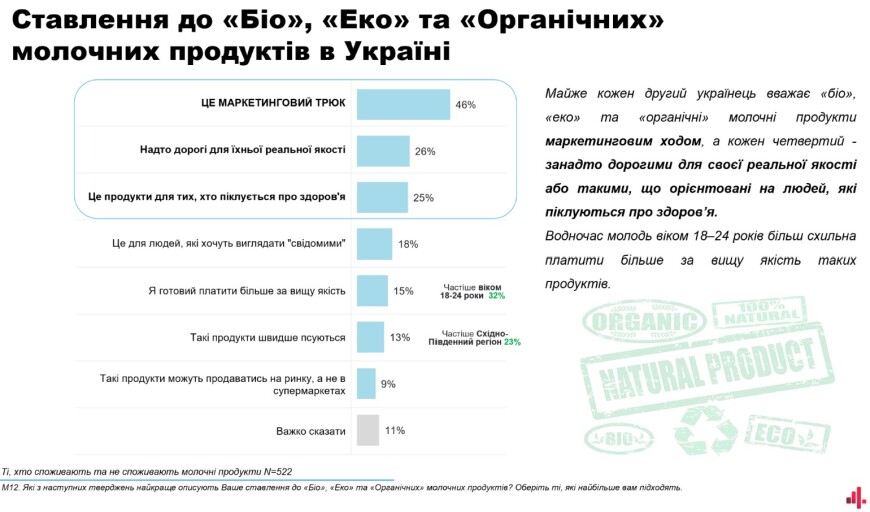 Майже половина українців вважають позначки «біо» чи «еко» просто маркетинговим трюком. Проте серед молоді спостерігається інша тенденція: 18-24-річні готові платити більше за «чисті» продукти. Саме ця аудиторія формує нову нішу преміального локального виробництва
