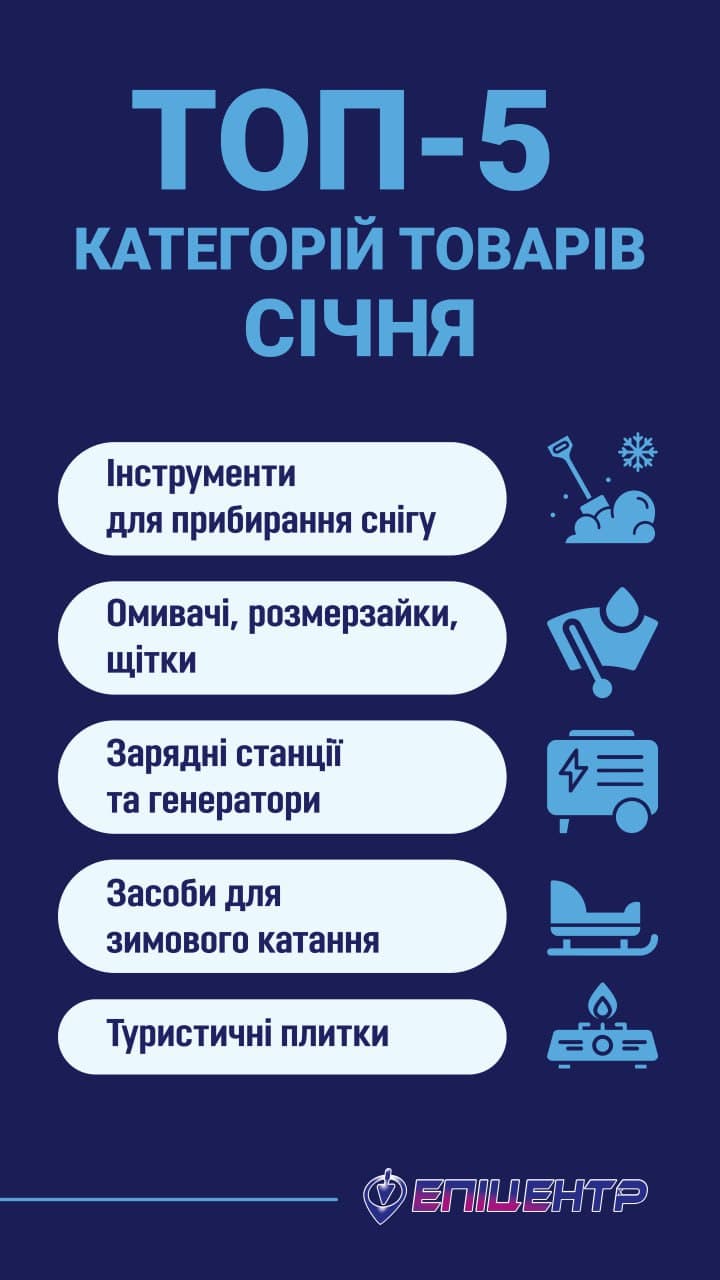 Через складні погодні умови в січні зафіксовано ажіотажний попит на інструменти для прибирання снігу та протиожеледні засоби. Лише за перші два тижні місяця в мережі «Епіцентр» було реалізовано стільки ж снігових лопат, скільки за весь 2025 рік, а обсяги продажу реагентів для боротьби з ожеледицею майже досягли річних показників минулого року.