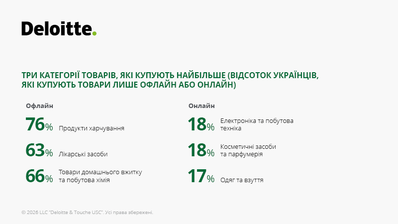 Базові покупки українці переважно здійснюють у фізичних магазинах. Зокрема, 76% споживачів купують офлайн продукти харчування (72% у 2024 році), 63% — лікарські засоби (59% у 2024 році), а 66% — товари домашнього вжитку та побутову хімію (64% у 2024 році).